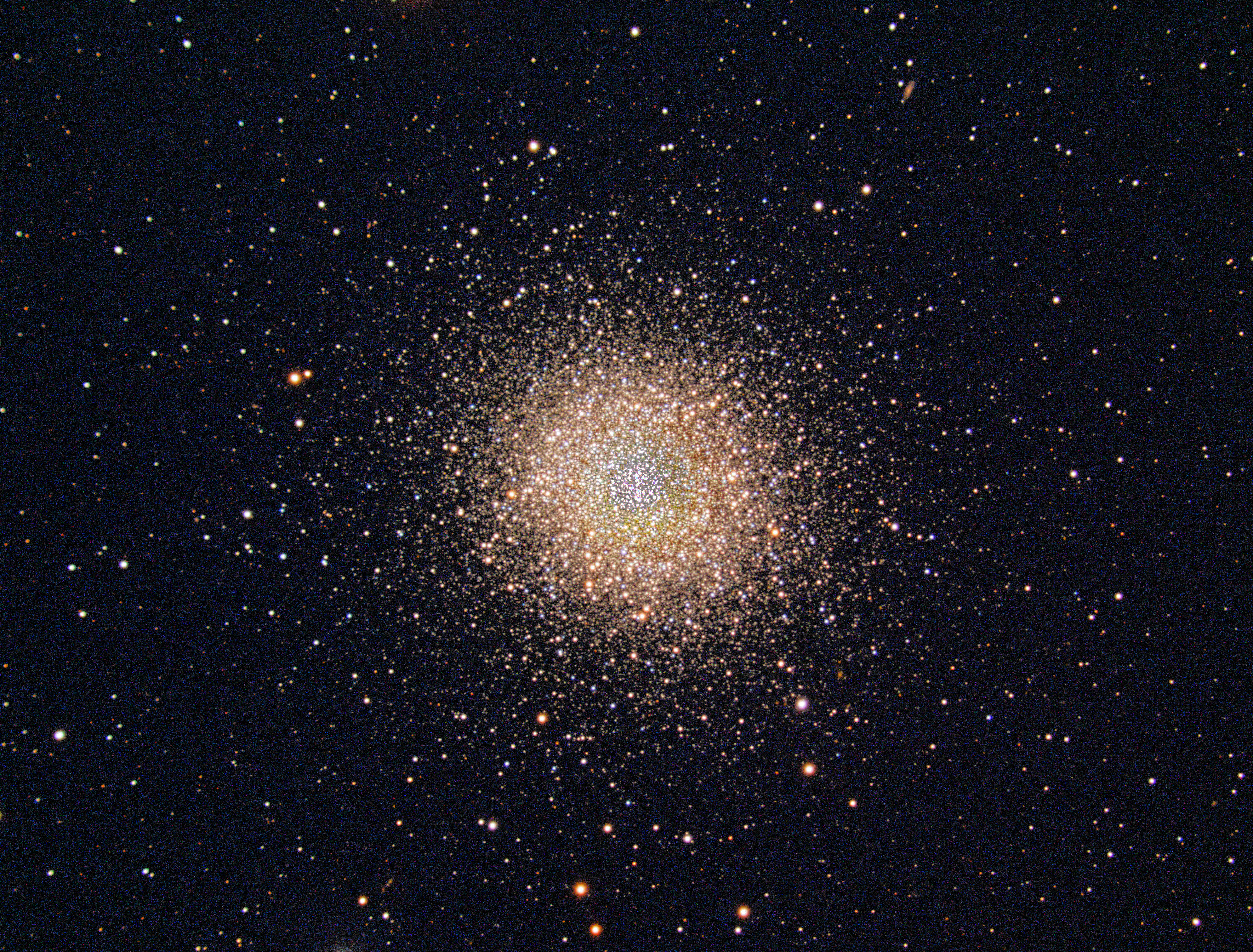 Globular cluster M13 in the constellation Hercules shines with over 100,000 stars at 25,000 light-years from Earth. This cropped image is a joint project of James Foster and me using my Celestron 11-inch black tube Schmidt Cassegrain telescope at f/7 (focal length= 1955 mm). file: M13masC11-Color133min20128May24A-2asm.jpg Photographic Data Date: May 28, 2024 telescope: Celestron 11-inch (MAS's black tube) SCT with Starizona f/7 focal reducer/flattener Focal Length: 1,955 mm