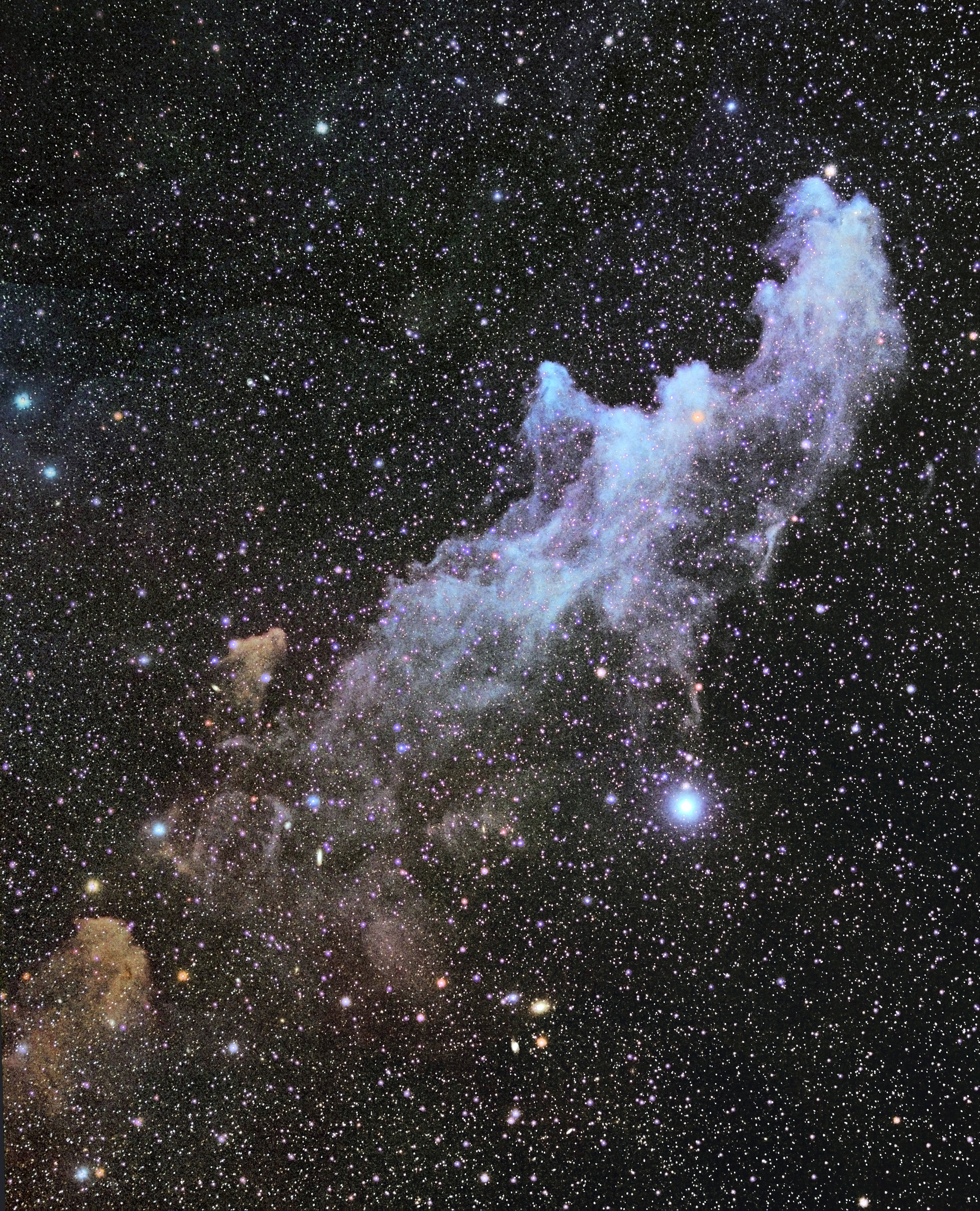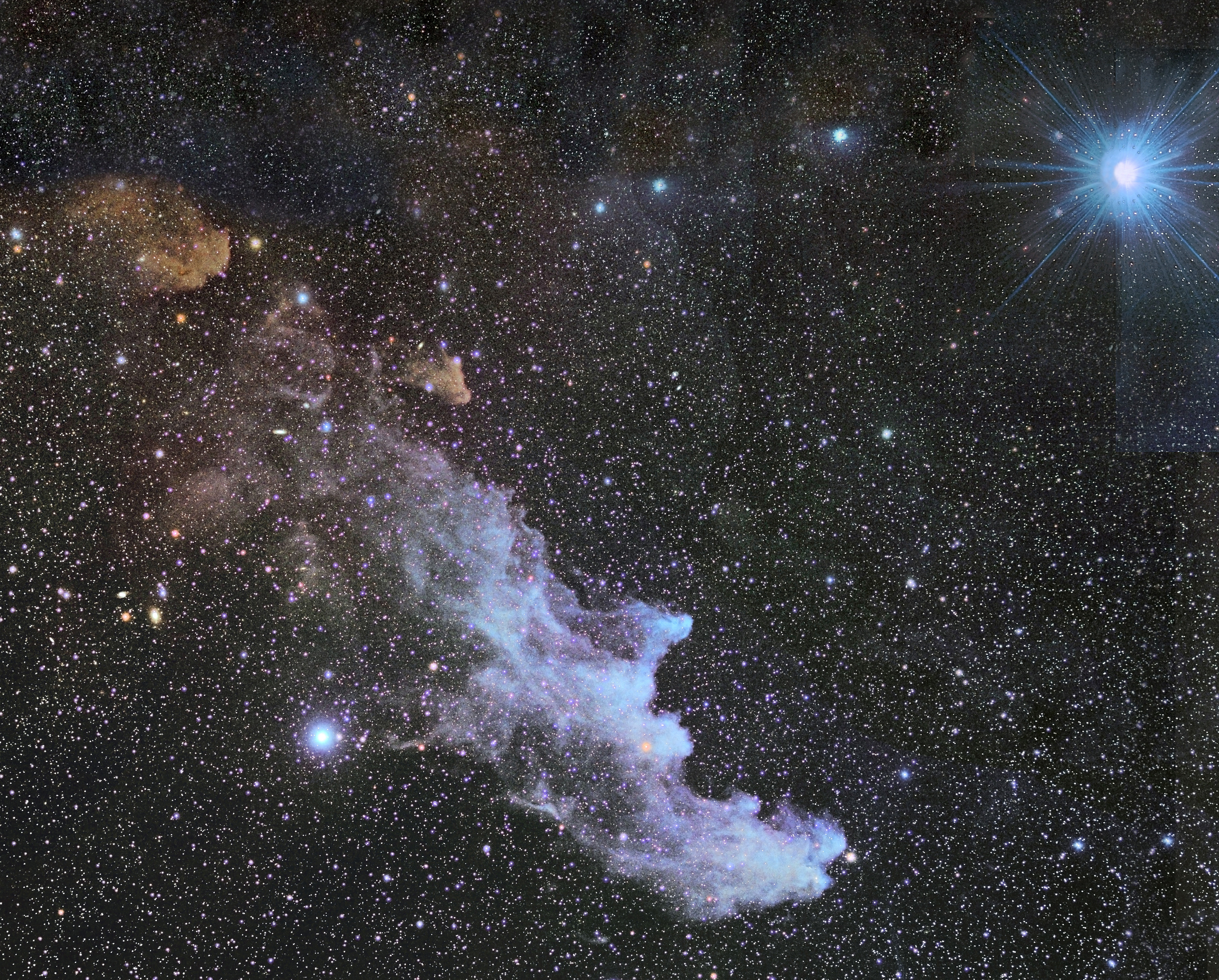 ![]() Cropped & flipped image of photo above "Witch Head Nebula": Askar 103APO at f/4 in O-III & RGB light Click here for full resolution photo file: WitchHeadNeb-OIIIRGB4C-JRForig-a1cr1x1rotGXPrbd2-acrsm.jpgg |