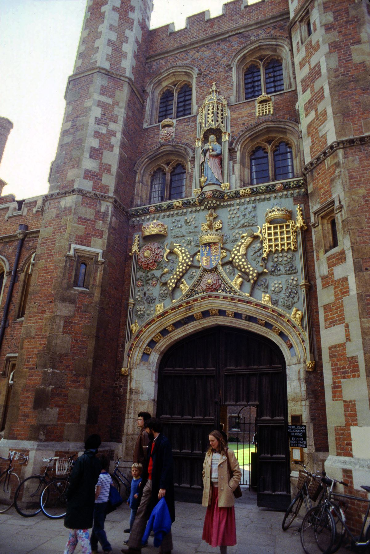 . Built in 1516 by the mason William Swayne. The statue above the door is of St. John the Evangelist the patron saint of the college. The rest of the carvings are the symbols and coat of arms of the Foundress of the college, Lady Margaret Beaufort. Her charges supporting the shield are mythical beasts called yale - chimera with the head of a goat, the body of an antelope and the tail of an elephant. A yales horns were supposed to be able to swivel from back to front which is why they are shown pointing in opposite directions.  |