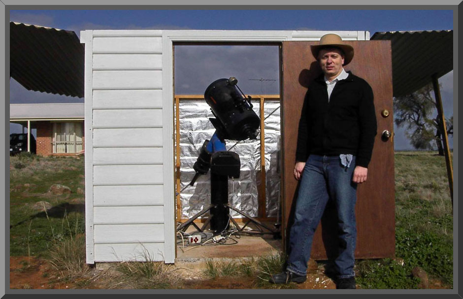 Biography My first telescope was the standard 2" dime store refractor. By the mid seventies I had migrated to a 10" Newtonian reflector. The Newtonian was used for visual astronomy for the next 10 years from the light polluted city of Melbourne Australia. For a while in the mid eighties I gave up visual astronomy due to the unfavourable location. I started however to take a keener interest in astrophotography. I had always been interested but was put off by the complexities and high cost of the activity. Finally in 1991, I bit the bullet and started my foray into astrophotography. I purchased a Celestron C-11. I made the transition from emulsion to digital astro imaging in 1997. Outside of astro-imaging, I am a Material Scientist in the automotive industry (Toyota), basically a trouble shooter for vehicles during the production stage, and in the field. My other interests include martial arts, bush walking, computer chess, archaeology and music.