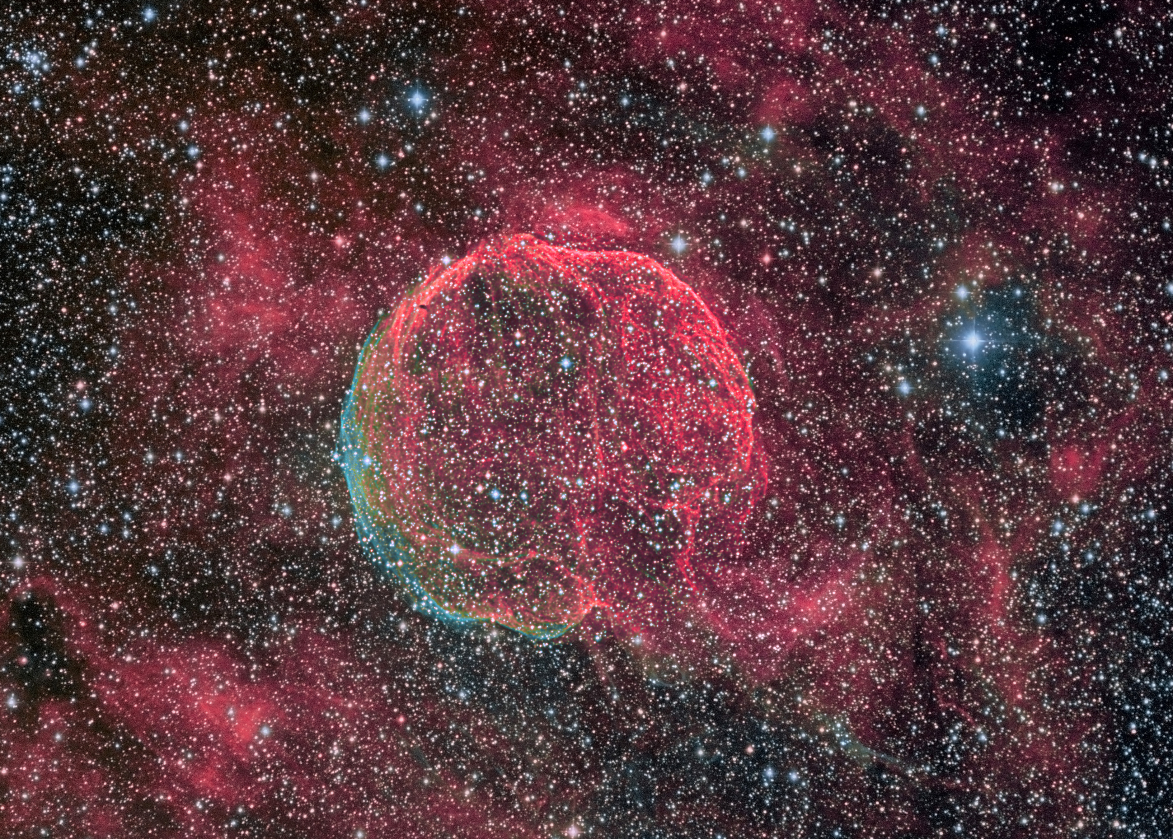 iOptron CEM60 imaging cameras: ZWO ASI6200MM-Pro monochrome camera with filters cropped image exposure & filters: Astrodon Hydrogen-alpha, Oxygen III, &RGB filters were used with exposures of 270, 360, 43, 47, & 47 minutes respectively for just under 13hrs total exposure time processing ASI Studio and Adobe Photoshop Elements photographic site: Pinon Pines Estates (Frazier Park California) (Bortle 4 at 5,500 ft elevation) |