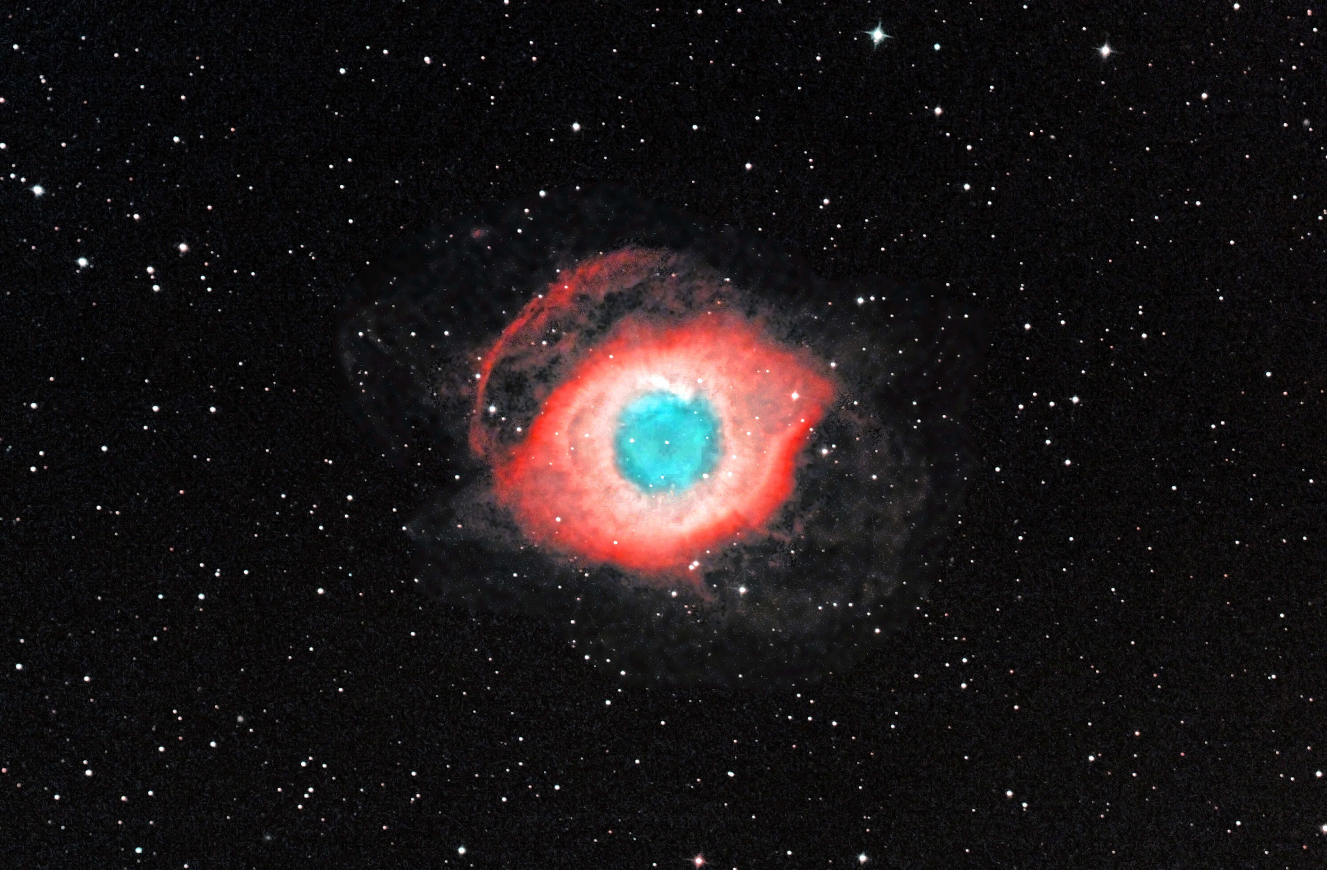 ![]() Helix Nebula (NGC 7293), cropped The Helix Nebula (NGC 7293) is a nearby planetary nebula in the constellation Aquarius. It is the final stage of a dying sun-like star that was formed when the star shed its outer layers, leaving behind a central white dwarf. This is a joint project of James Foster and me using a Sky-Watcher Quattro 250P 10-inch f/4 Newtonian telescope with a ZWO ASI2600MC-Pro color camera and Optolong L-eXtreme 7 nm nebular filter (Hydrogen-alpha and Oxygen-III wavelengths pass) for 6-hour stacked exposure and cropped image file: astHelixEEfilter365minEXP2B-abccr.jpg Click here for full resolution photo Photographic Data telescope: Sky-Watcher Quattro 250P (10-inch f/4 Newtonian telescope with coma corrector) FL= 1,000 mm mount: iOptron Cem60 guiding off-axis imaging cameras: ZWO ASI2600MC-Pro color astrocamera with Optolong L-eXtreme nebular filter (bandwidth 7nm for both Hydrogen-alpha and Oxygen-III) filter: Optolong L-eXtreme nebular filter (bandwidth 7nm for both Hydrogen-alpha and Oxygen-III) exposure: 136 X 160 sec total exposure time: 365 minutes or 6 hours .photographic site: James Foster observatory at Pinon Pines Estates (Frazier Park) California (Bortle 4 at 5,500 ft elevstion) ![]() Helix Nebula (NGC 7293) same as above, but before it was cropped file: HelixEEfilter365minEXP2B-a2.jpg Click here for full resolution photo |
