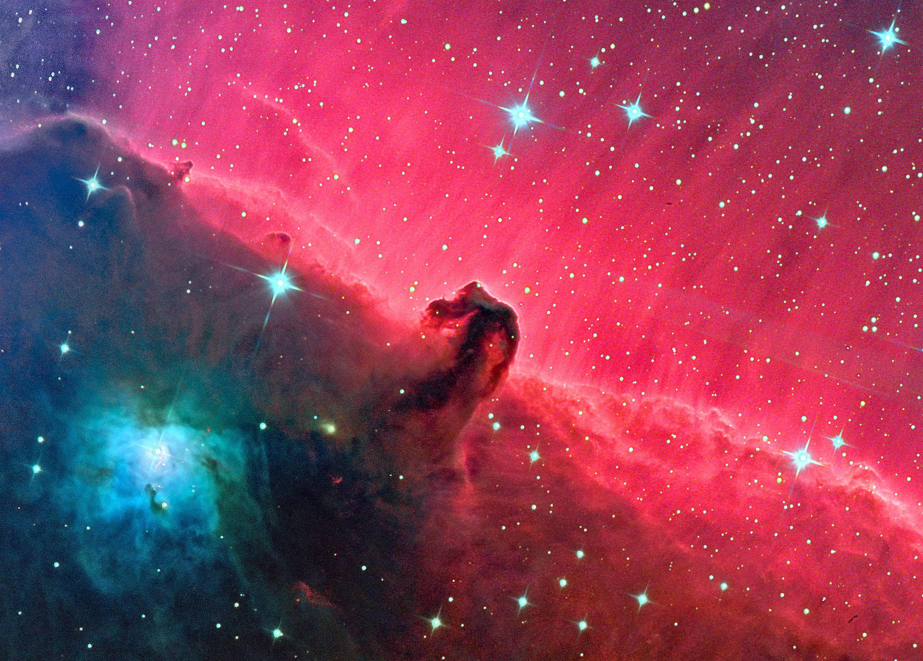 This is a crop of the photo below. The dark Horsehead Nebula (Bernard 33) is adjacent to the most eastern star, Zeta Orionis, in the belt of the Orion constellation. This is a joint collaboration of James Foster of Frazier Park California and Michael Stecker of Los Angeles. A Sky-Watcher 250P, 10-inch f/4 Newtonian, telescope was used at Frazier Park. Click here for full resolution photo file: HorseheadJRF-10Newt115minHL_HR_G_B3B-9262023-a3-cr1a.jpg Photographic Data telescope: Sky-Watcher Quattro 250P, 10-inch f/4 Newtonian telescope with coma corrector Focal Length: 1,000 mm