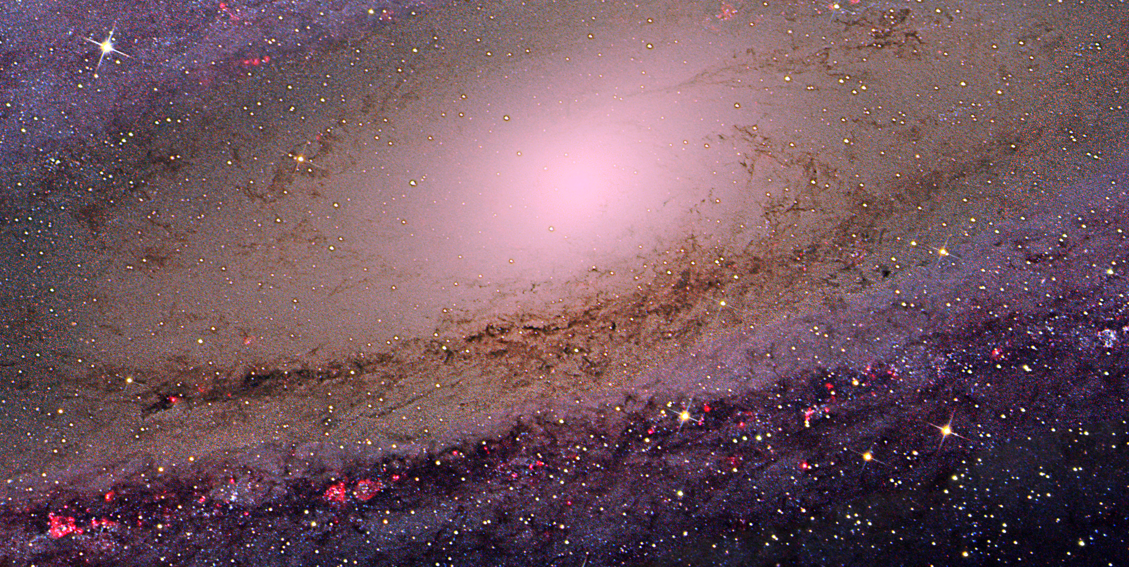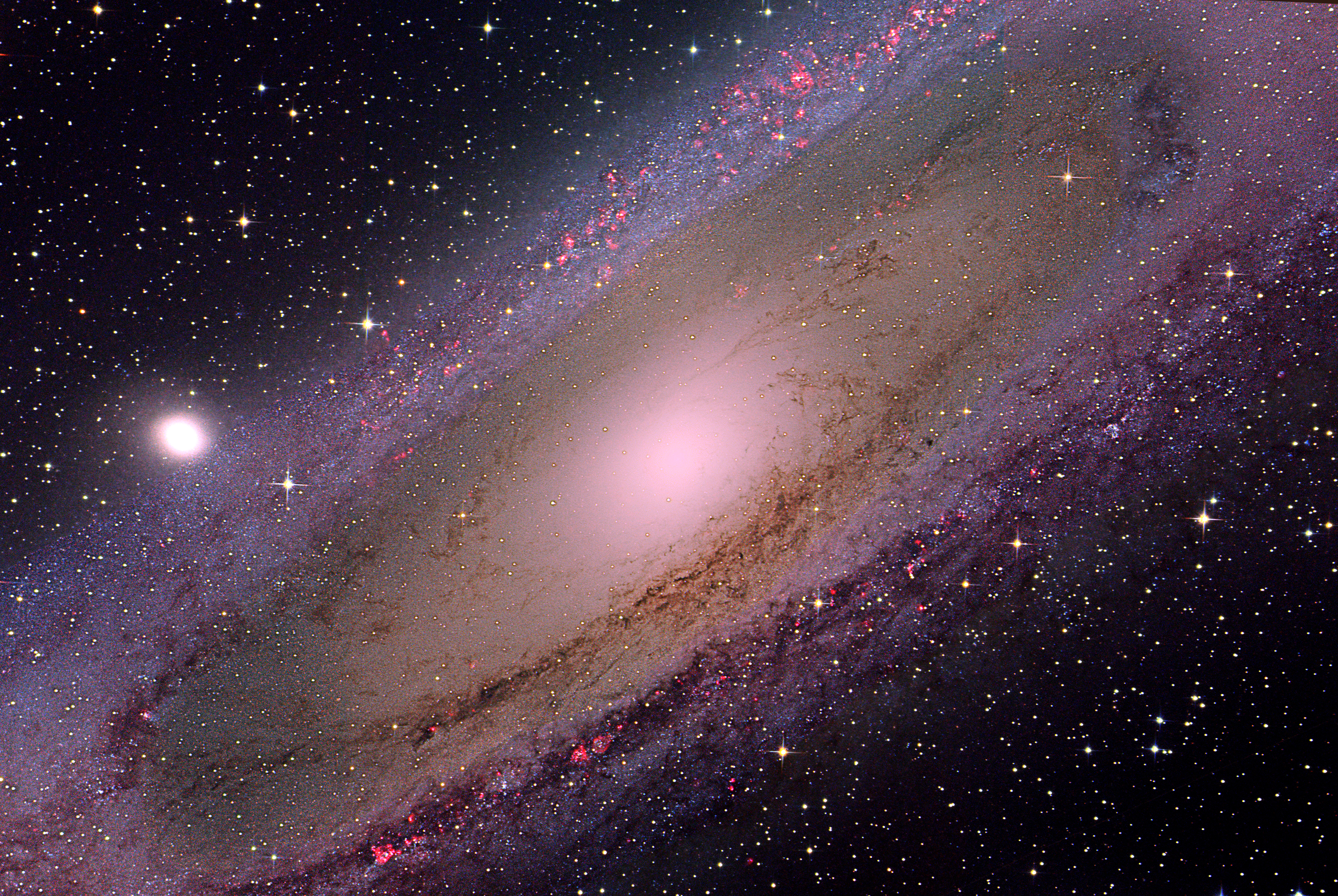 ![]() This is a crop of the photo above. One can see the dark dust lanes and bright red star forming regions in the foreground. file: M31JRF-55min-17Sep23-RGB2B&HA-a-rcr2.jpg |