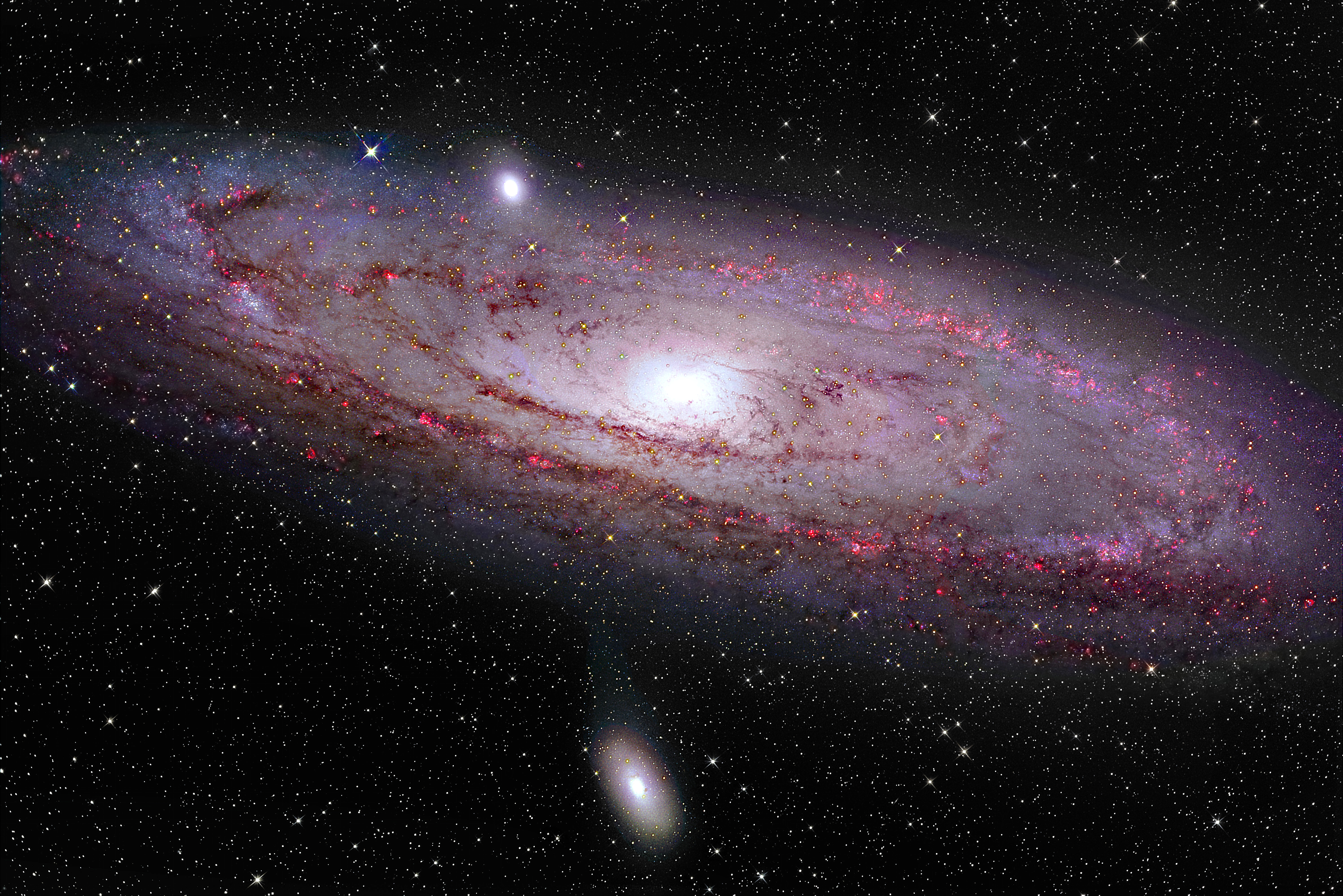 ![]() M31 Andromeda Galaxy -- full color HaRGB M31 was shot in full color with a monochrome ZWO ASI6200MM-Pro full frame camera on a Sky-Watcher Quattro 250P 10-inch f/4 Newtonian telescope through hydrogen-alpha, red, green and blue filters. This is a joint project of James Foster and Michael Stecker. Click on image to see high resolution photo. file: M31JRF10NewtASI6200MM-Ha38x5-RGB300x11-MASc.jpg Photographic Data telescope: Sky-Watcher Quattro 250P (10-inch f/4 Newtonian telescope with coma corrector) FL= 1,000 mm mount: Astro-Physics 1200 GTO