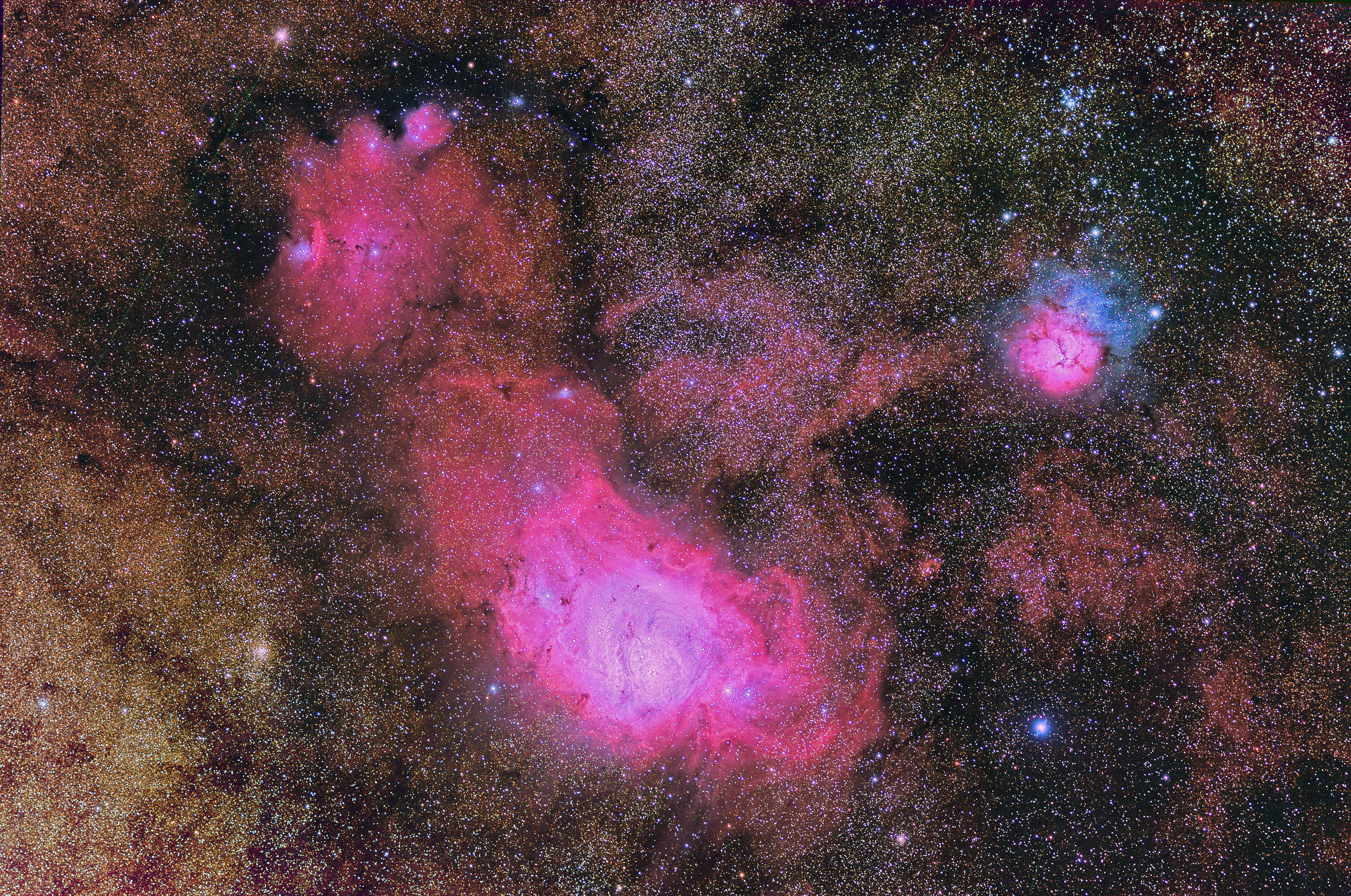 | Version 2 of M8-M20-B303 complex in Sagittarrius file: M8-M20-B303-LHRGB_Gr-RBF3Cflat4ClastJRF-2asm.jpg ![]() Lagoon (M8), Trifid (M20), NGC6559, IC4685, B302, B303 complex in Sagittarius Version2 file: M8M20B303-LHRGB_Gr-RBF3Cflat4ClastJRF-2asm.jpg |