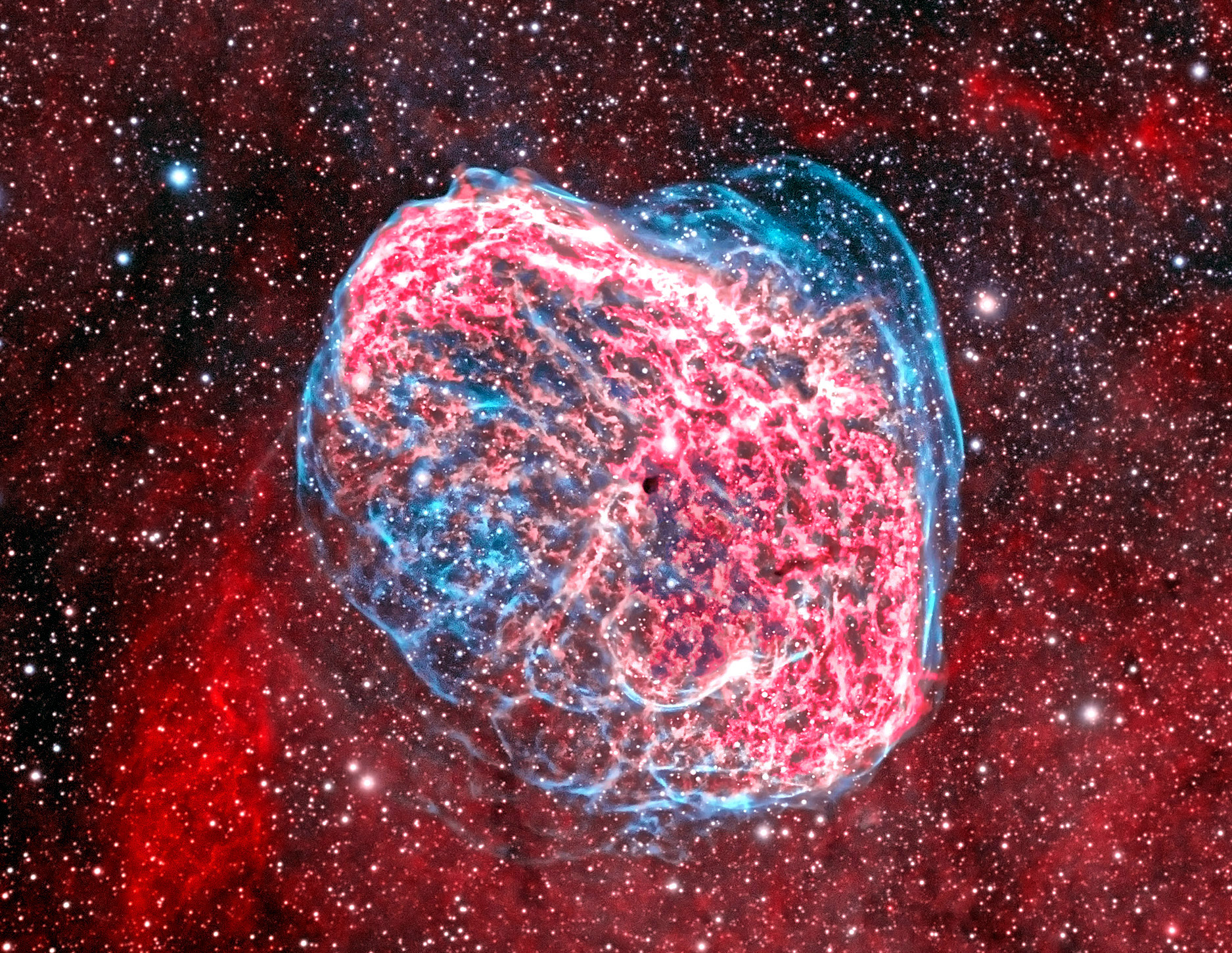 ![]() The "Crescent Nebula", NGC 6888 or Sh2-105 in HOO light (cropped) The Crescent Nebula (NGC 6888) lies in Cygnus 5,000 light-yease from Earth. It was formed by fast stellar winds from the very large hot Wolf-Rayet star WR 136 (HD 192163). Some time between 120,000 and 240,000 years ago, WR 136 entered its red supergiant phase, at which time it ejected around five solar masses’ worth of material that is still moving away from the star. But the solar wind that is emitted by WR 136 in its current state moves much faster than that: around 1,700km/s (1,056 miles/second). When this wind crashes into the older, slower-moving material, it effectively bounces off it, creating an inward-moving shockwave that heats the stellar wind to X-ray emitting temperatures, giving the nebula its glow. This is a cropped HOO image photographed with a Celestron 11-inch SCT (black tube) at f/7 through 3 nm Hydrogen-alpha and Oxygen-III filters and ZWO ASI6200MM-Pro monochrome camera. It is a joint project of James Foster and Michael Stecker. file: NGC6888-C11HOO-a2cr3.jpg Click here for full resolution photo Photographic Data telescope: Celestron 11-inch (black tube) SCT with Starizona 0.75X reducer/flattener Aperture: 2,794 mm (11-inches) Focal length = 2,095 mm Focal ratio: f/7.5 mount: Astro-Physics 1200 GTO guiding: Off-axis with ZWO ASI120MM mini camera imaging camera: ZWO ASI6200MM-Pro monochrome camera (cropped image) exposure: 3 nm Hydrogen-alpha for 350 minutes and 3 nm Oxygen-III for 460 minutes. Total exposure time: 810 minutes or 13.5 hours photographic site: James Foster observatory at Frazier Park California (Bortle 4 at 5,500 ft elevstion) |