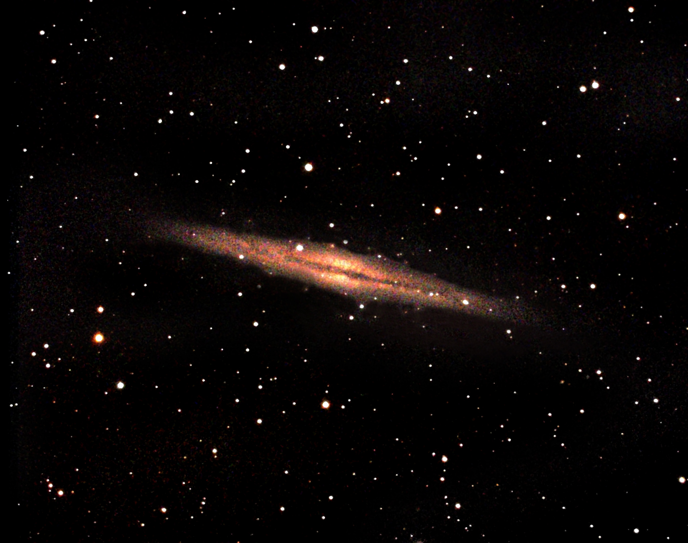 ![]() NGC 891 NGC 891 is an "edge-on" galaxy thought to be similar to our own Milky Way. It is about 30 million light-years from earth. This was a 2.2-hour exposure from my Los Angeles backyard with a 9.25-inch telescope at f/7. file: NGC891-240sX20P3Cel925f7ASI533L-Pro9242023b2a2d.jpg Photographic Data telescope: Celestron EdgeHD 9.25-inch SCT at f/7 mount: ZWO AM5 harmonic mount guiding hardware: SVBony 60 mm f/4 guidescope (fl=240 mm) Guide Camera: ZWO ASI1662MC imaging camera: ZWO ASI533MC-Pro co;or camera at 14-degrees F through an Optolong L-Pro light pollution filter exposures: 240 seconds X 20 (153-minutes or 2.5 hours) processing: Stacked in Asiair Plus and cropped and post-processed in Adobe Photoshop Elements photographic site: West Los Angeles http://mstecker.com/pages/chhouses_fp.htm (Bortle 9 light polluted sky) |