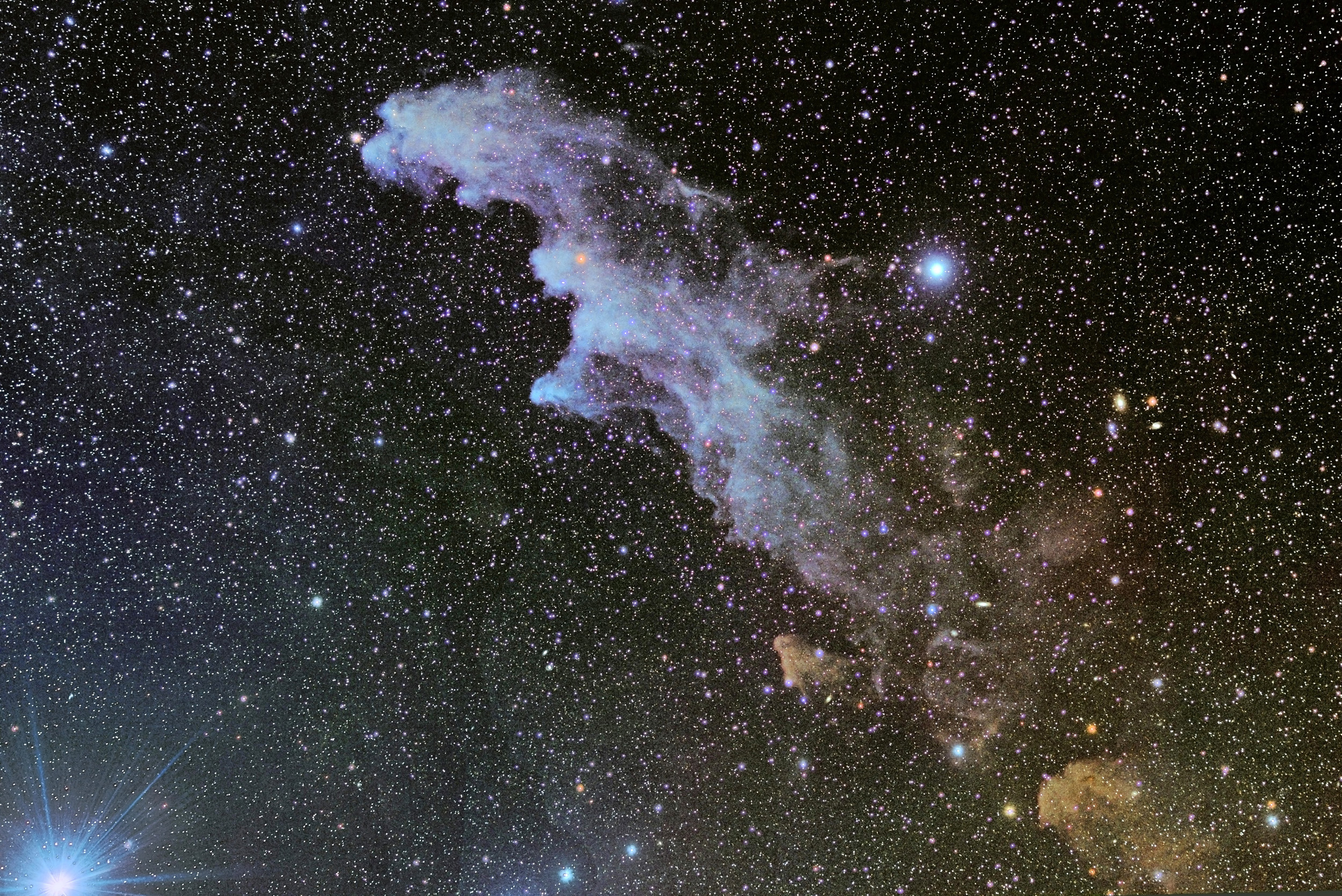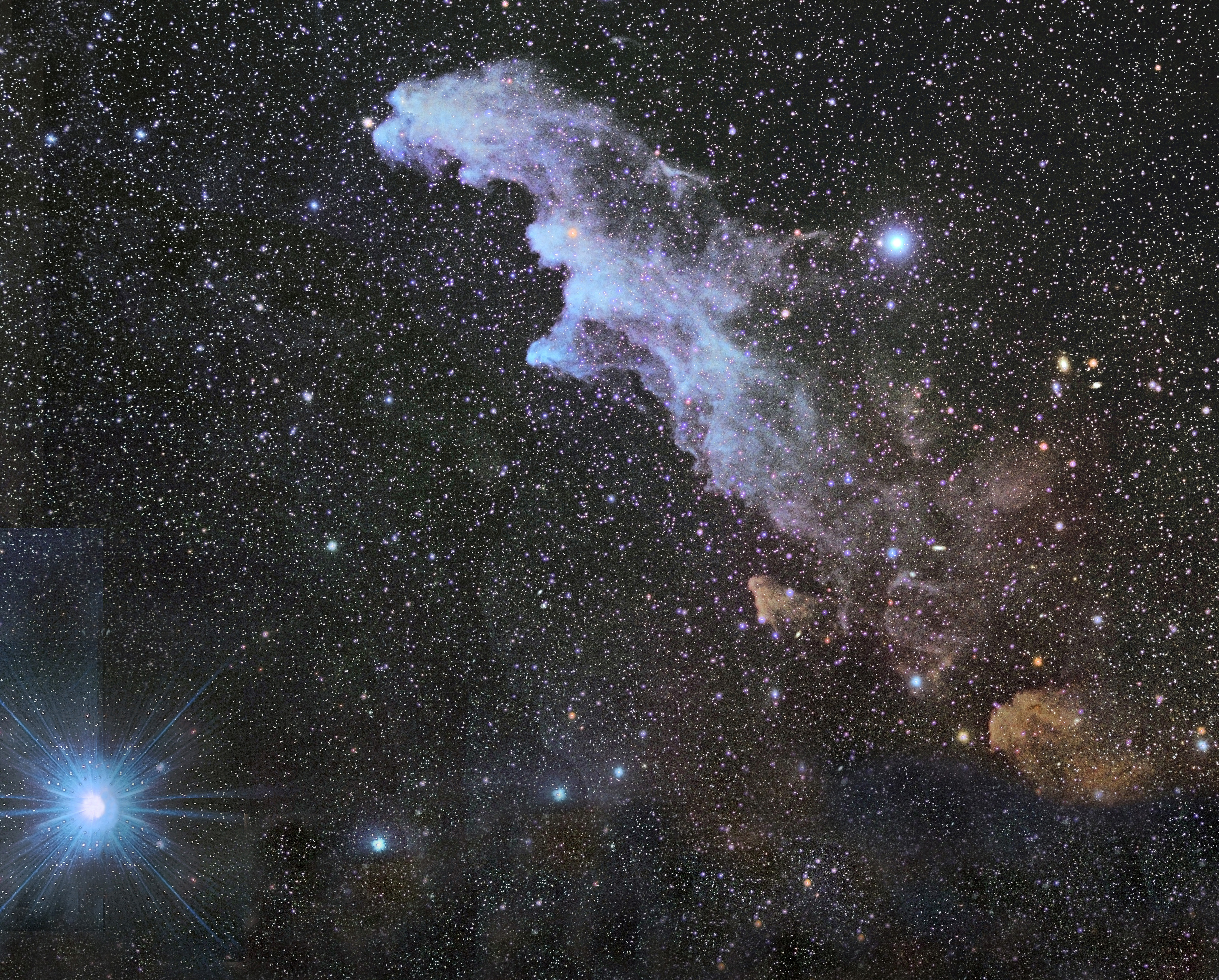 ![]() Cropped & flipped image of photo above "Witch Head Nebula": Askar 103APO at f/4 in O-III & RGB light Click here for full resolution photo file: WitchHeadNeb-OIIIRGB4C-JRForig-a1cr1x1rotGXPrbd2-acrsm.jpgg |