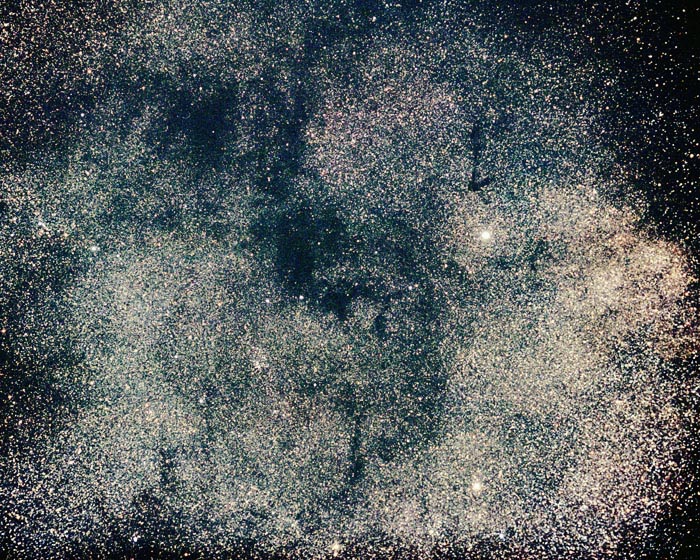 At the center of the image is dark nebula Barnard 110 and to its upper left (11 o'clock) Barnard 113. Along the left border of the image are Barnard 117a and 119a. To the right of center (3 o'clock) is the bright star Beta-Scuti. Just above (north) this star is the small hook shaped dark nebula Barnard 104. A small open cluster NGC 6704 is seen to the lower left (7 o'clock) of B110. The region of golden colored stars in the right lower quadrant of this photo represents the northern part of the Scutum Star Cloud, that E.E. Barnard called the "Gem of the Milky Way". The bright M11 (Wild Duck) cluster is just below (south) the field of view of this photo and not seen here. A photo of it can be seen at M11sf.