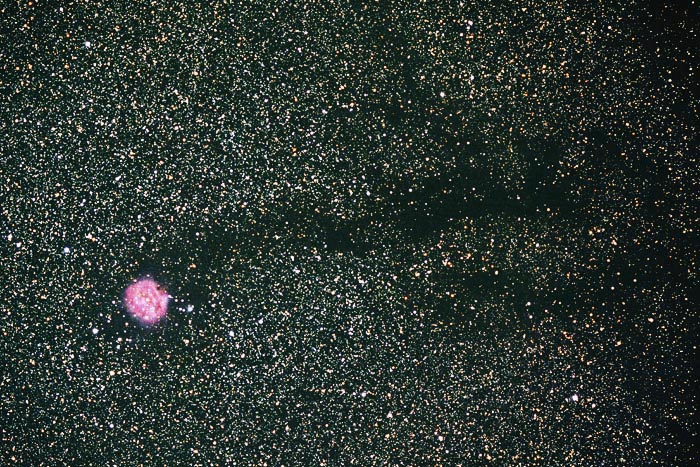 The round Cocoon nebula is seen at the lower left of the image and the long dark nebula B168 is seen extending from it across the image to the right. The Cocoon is primarily a red emission nebula (Sharpless-125) but does have blue reflection and dark components as well. Embedded in the nebula is open cluster IC 5146.