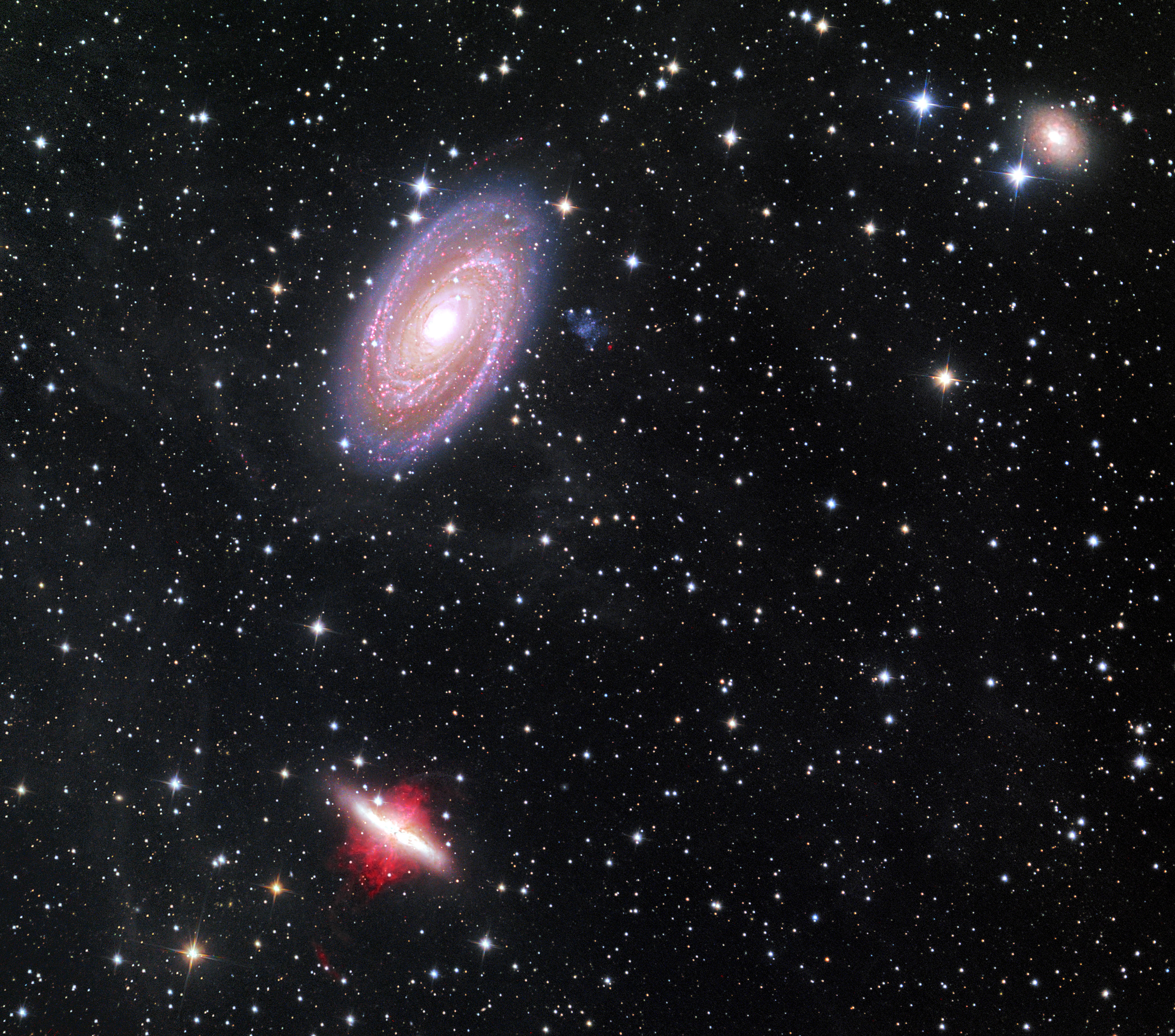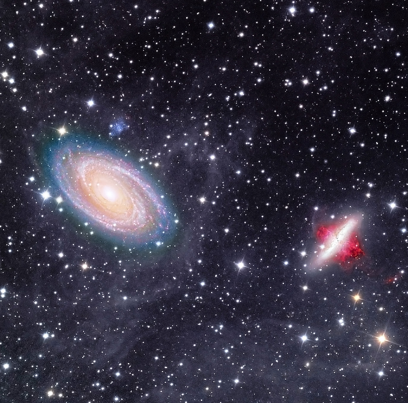 version 2![]() M81, M82, Holmberg IX dwarf galaxy and NGC3077 version 2 Four galaxies from bottom to the top going CCW, M82 (with Ha complex), M81(largest spiral), Holmberg IX (dwarf galaxy [blue splotch right of M81]), and NGC 3077 (upper right corner). Shot with the skywatcher 10-inch newtonian at f/4 in the iOptron CEM60 equatorial mount. Exposures made were 462min clear and 588min with 3nm Astrodon H-Alpha filter with the ZWO ASI6200MM and 125min color camera with the ZWO ASI6200MC camera. file: M81&M82-LMorig&M81br-flat-crrc1.jpg.jpg Click here for full resolution photo Photographic Data telescope: Sky-Watcher Quattro 250P (10-inch f/4 Newtonian telescope with coma corrector) FL= 1,000 mm mount: iOptron Cem60 guiding off-axis imaging cameras: ZWO ASI6200MC-Pro color astrocamera ZWO ASI6200MM-Pro monochrome astrocamera exposures: 3 nm Hydrogen-alpha: 588 min Lum: 462 min (mono camera) color camera: 125 min Total exposure time: 1,175 min (19.6 hours) .photographic site: James Foster observatory at Pinon Pines Estates (Frazier Park) California (Bortle 4 at 5,500 ft elevstion) Crop to M82 galaxy, version 2 ![]() M82 cropped from photo above version 2 file: M81&M82-LMorig&M81br-flatrotcr3cr.jpg Click here for full resolution photo Cropped image of M81 & M82 with Integrated Flux Nebulae (IFN) in Ursa Major, version 2 ![]() Cropped image of M81 & M82 with Integrated Flux Nebulae (IFN) in Ursa Major version 2 The milky nearly white clouds are integrated flux nebulae (IFN). They are a relatively recently identified astronomical phenomenon. In contrast to the typical known gaseous nebulae within the plane of the Milky Way galaxy, IFNs lie beyond the main body of the galaxy. The term was coined by Steve Mandel who defined them as "high galactic latitude nebula that are illuminated not by a single star (as most nebula in the plane of the Galaxy are) but by the energy from the integrated flux of all the stars in the Milky Way. file: M81&M82_125minColorZwoASI6200MC&MonoCOLOR_regMASKs2B&HAcrop2-MAS1bcrr.jpg Click here for full resolution photo |