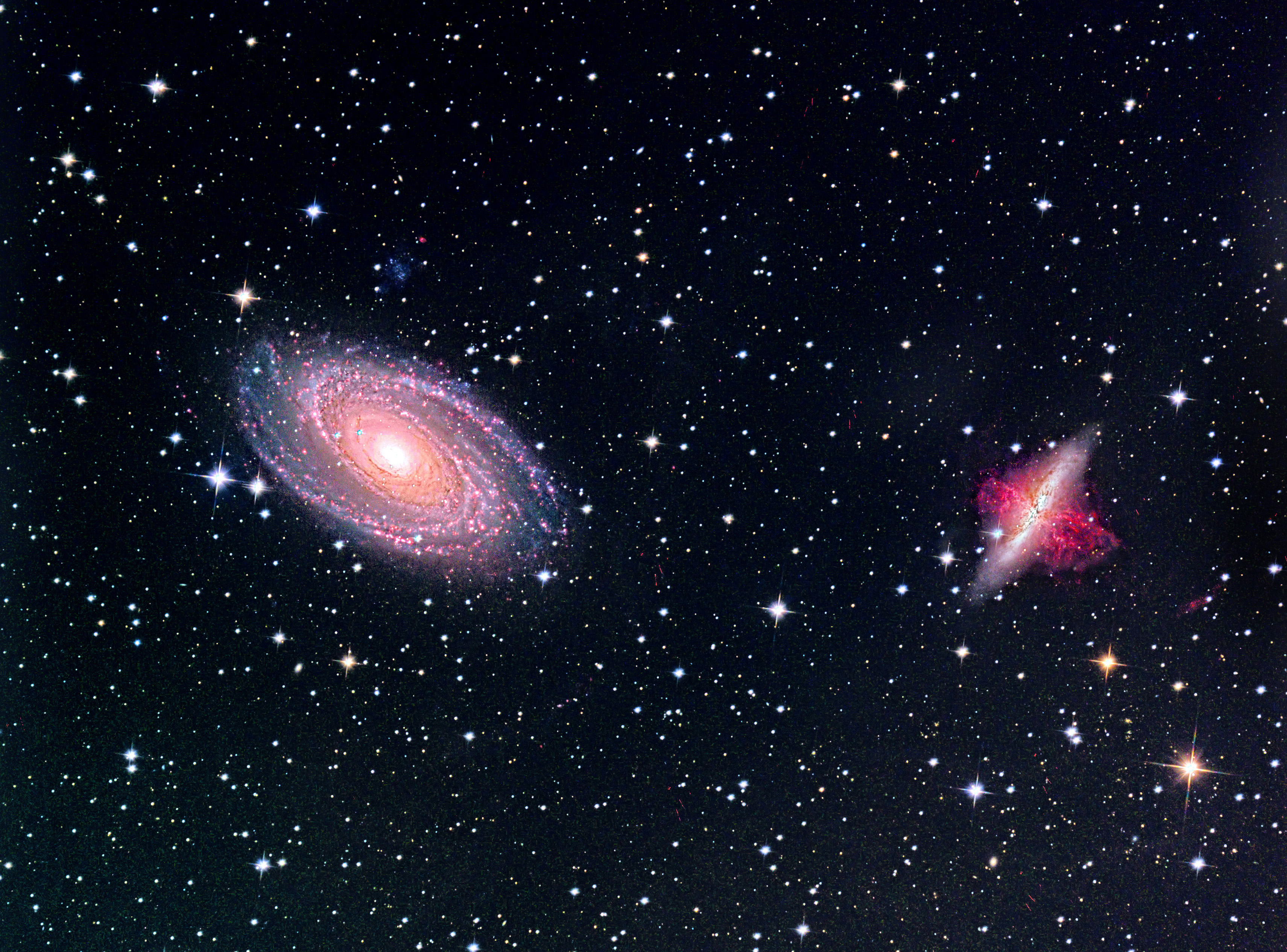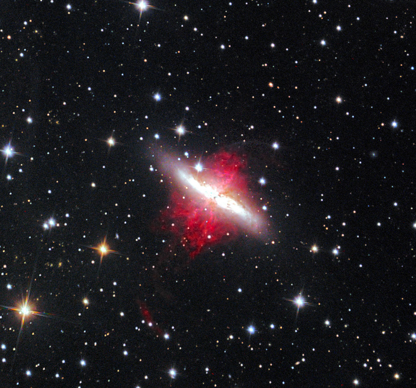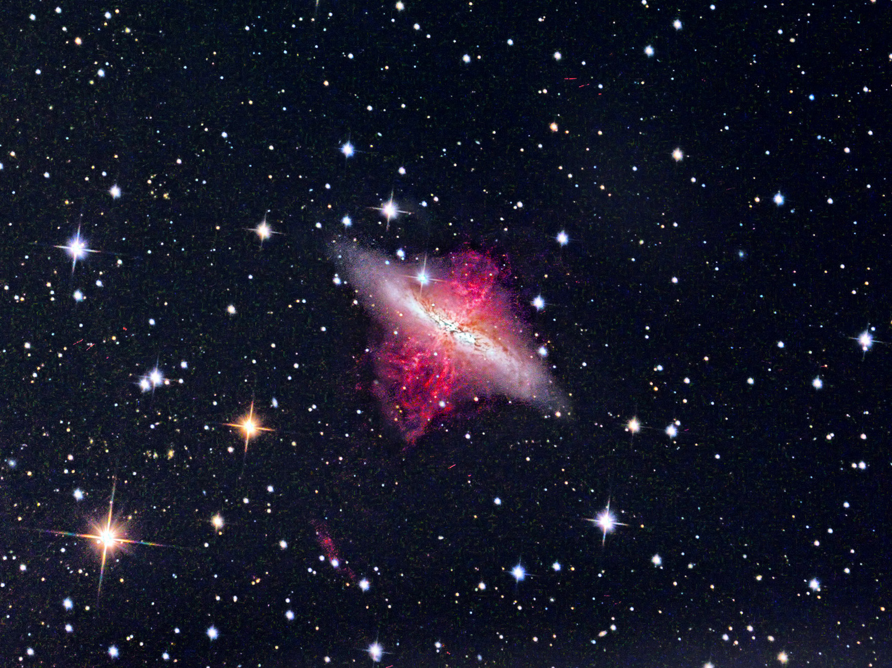![]() M82 version 1 (preliminary) This cropped photo of the M82 galaxy was taken by James Foster with a Sky-Watcher 10-inch f/4 Newtonian telescope. Messier 82 (M82), or the Cigar Galaxy, is an edge-on spiral undergoing a massive burst of star formation in its core. These stars are expelling violent winds that are blowing gas and dust out of the galaxy. The only hint of this are fountains of hot (red) hydrogen gas streaming out of its center. Shot by James Foster from Pinon Pines Estates, CA. file: prelimM81&M82_LUMHA125minColorZwoASI6200MC_reg2-mas1LM1x2rotcr1acrM82-db1.jpg Click here for full resolution photo Photographic Data telescope: Sky-Watcher Quattro 250P (10-inch f/4 Newtonian telescope with coma corrector) FL= 1,000 mm mount: iOptron Cem60 guiding off-axis imaging cameras: ZWO ASI6200MC-Pro color astrocamera ZWO ASI6200MM-Pro monochrome astrocamera exposures: 3 nm Hydrogen-alpha 588 min Lum 167 (mono camera) 125 min (color camera). Total esposure time: 880 min (14.6 hours) .photographic site: James Foster observatory at Pinon Pines Estates (Frazier Park) California (Bortle 4 at 5,500 ft elevstion) M81 and M8, version 1 (preliminary) ![]() M81 and M82 galaxies version 1 (preliminary) Same settings as above file: prelimM81&M82_LUMHA125minColorZwoASI6200MC_reg2-mas1LM1x2rotcr1d-drssm.jpg Click here for full resolution photo ![]() M81 and M82 galaxies version 1a (preliminary) Same settings as above file: prelimM81&M82_LUMHA125minColorZwoASI6200MC_reg2-mas1LM1x2rotcr1d-drs1sm.jpg Click here for full resolution photo **************************************** |
