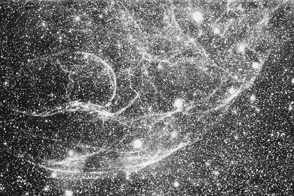 and faintest objects in the sky covering an area of 3 degrees (6 full moons). It is a supernova remnant not far from the Crab Nebula (M1) in Taurus. Like other SNR's it has a complex filamentary structure and radio source. It was discovered in the early 1950's at the Crimean Astrophysical Observatory. This image shows the southern third of the object.