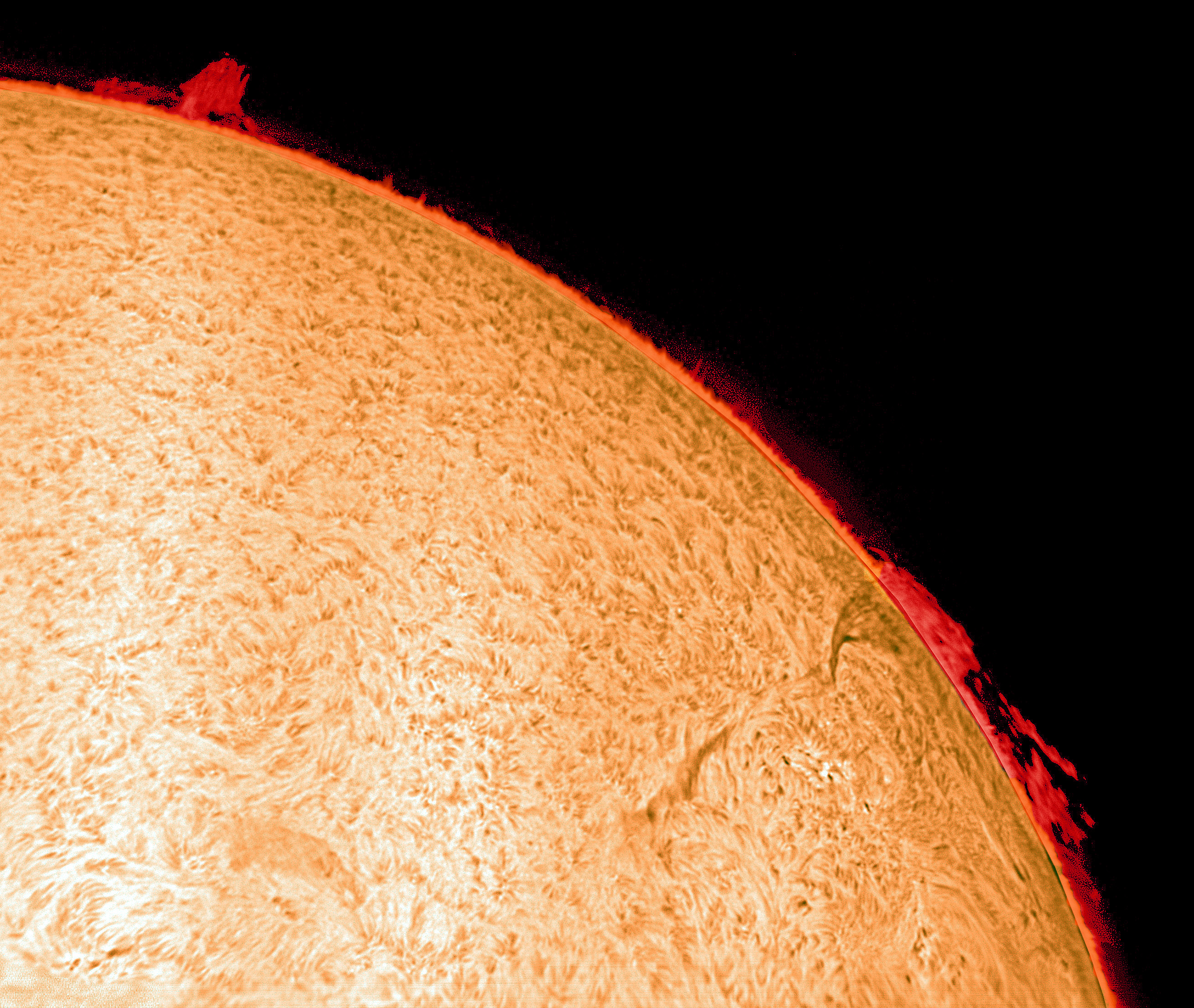 Prominences and surface features on July 1, 2023. Shot by James Foster at Frazier Park California in June. Colorized and post-processed by Michael Stecker file: sunJRFfrommysetup712023b.jpg Photographic Data telescope: William Optics ZenithStar 73