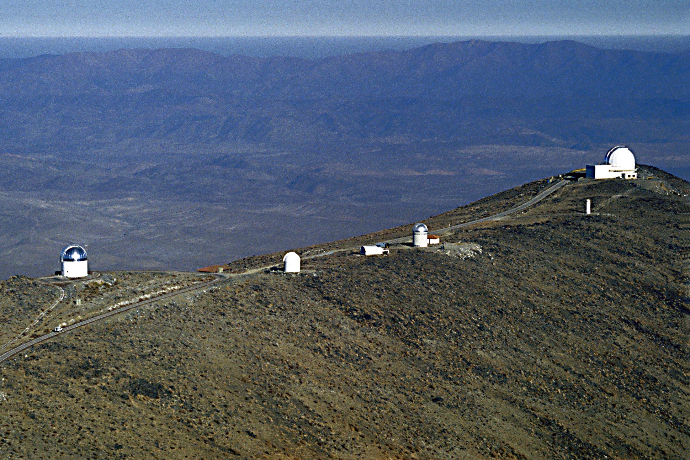 I took this photo from the hill of the future Magellan Telescopes when my friend James Foster and I visited Las Campanas for 10 days and nights in February, 1996. The observatory is at an altitiude of 2280 meters (7480 feet). At the far right is the DuPont 100-inch telescope, while at the far left