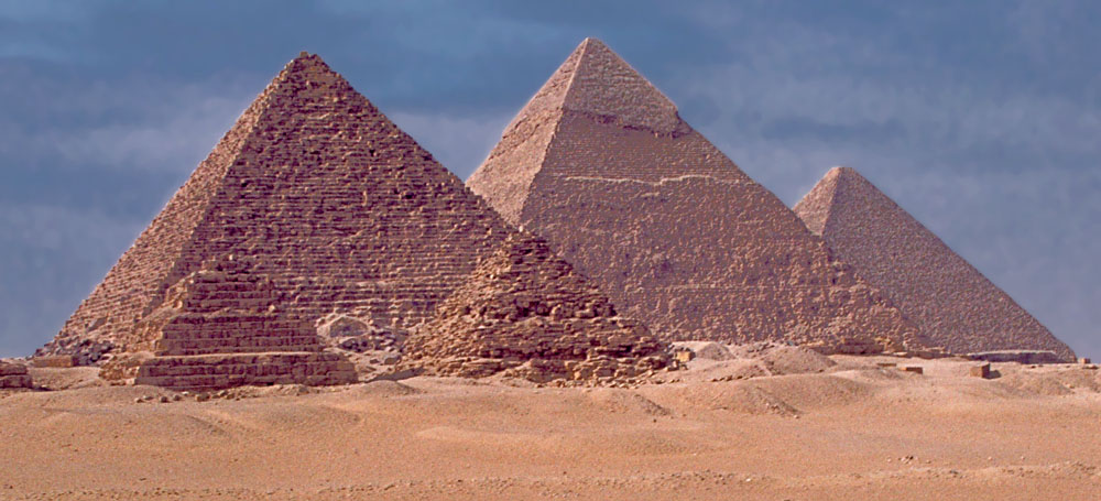 Khufu (aka: Cheops) is the oldest and largest and was erected about 2690 B.C. Its original hieght was 481 feet and its base covered 13 acres. Kheopheren, Khufu's son, built the second and slightly smaller of the large pyramids about 2650 B.C. The third built is the smallest of the three and was erected in about 2600 B.C. for Pharaoh Menkaru. Smaller pyramids can be seen in the left foreground. |