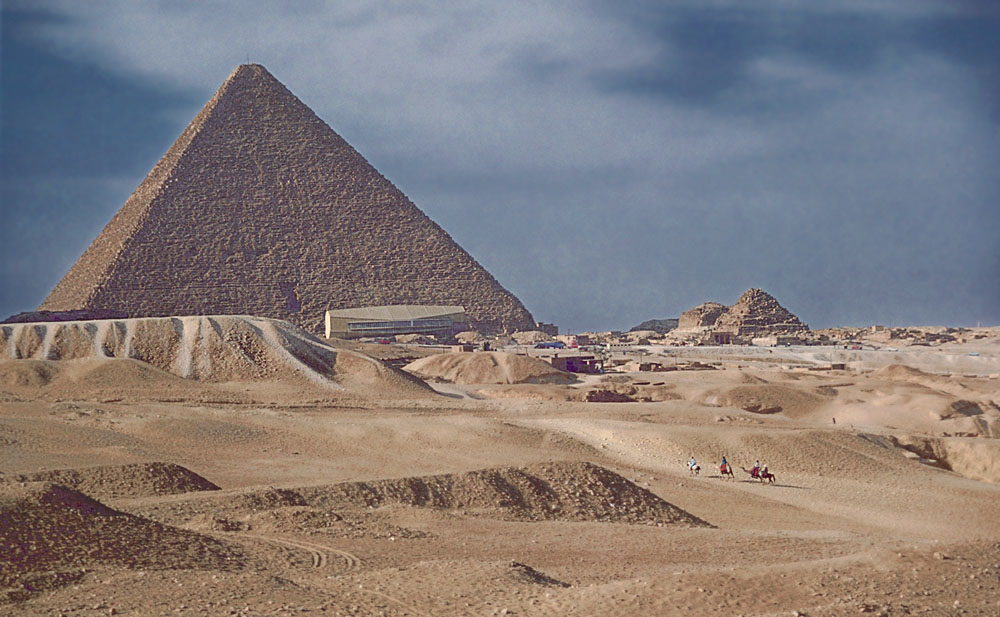 Three camels approach the large Khufu (Cheops) Pyramid. The building in front of the pyramid houses the ancient boat that the pharoah was to use in the after life.