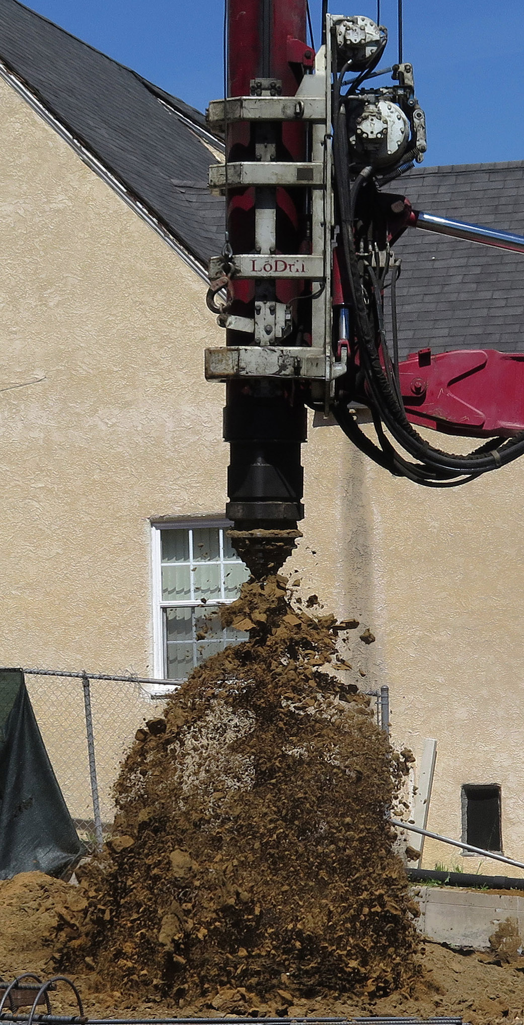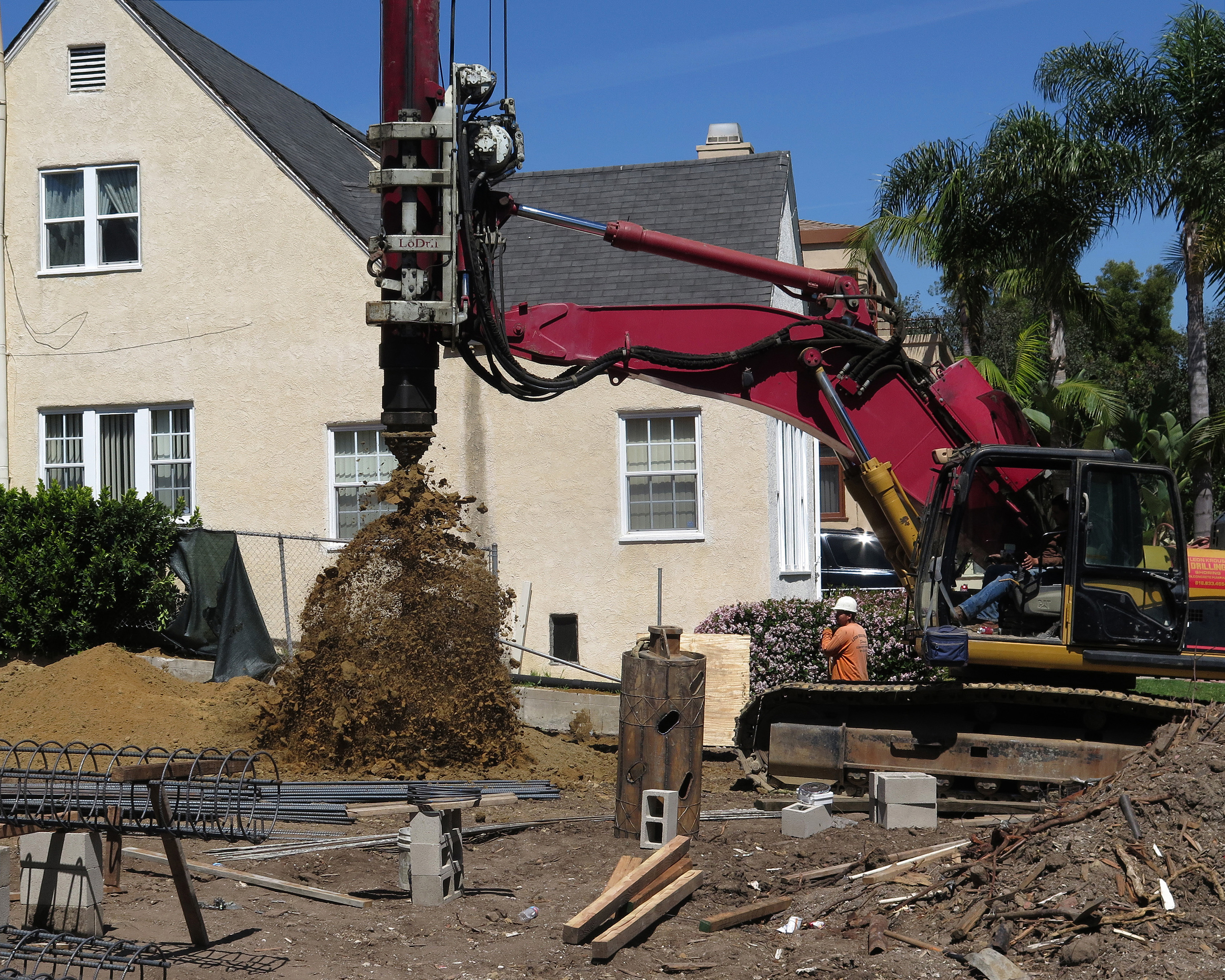 Spinning dirt auger for retaining wall foundation on March 29, 2017 .