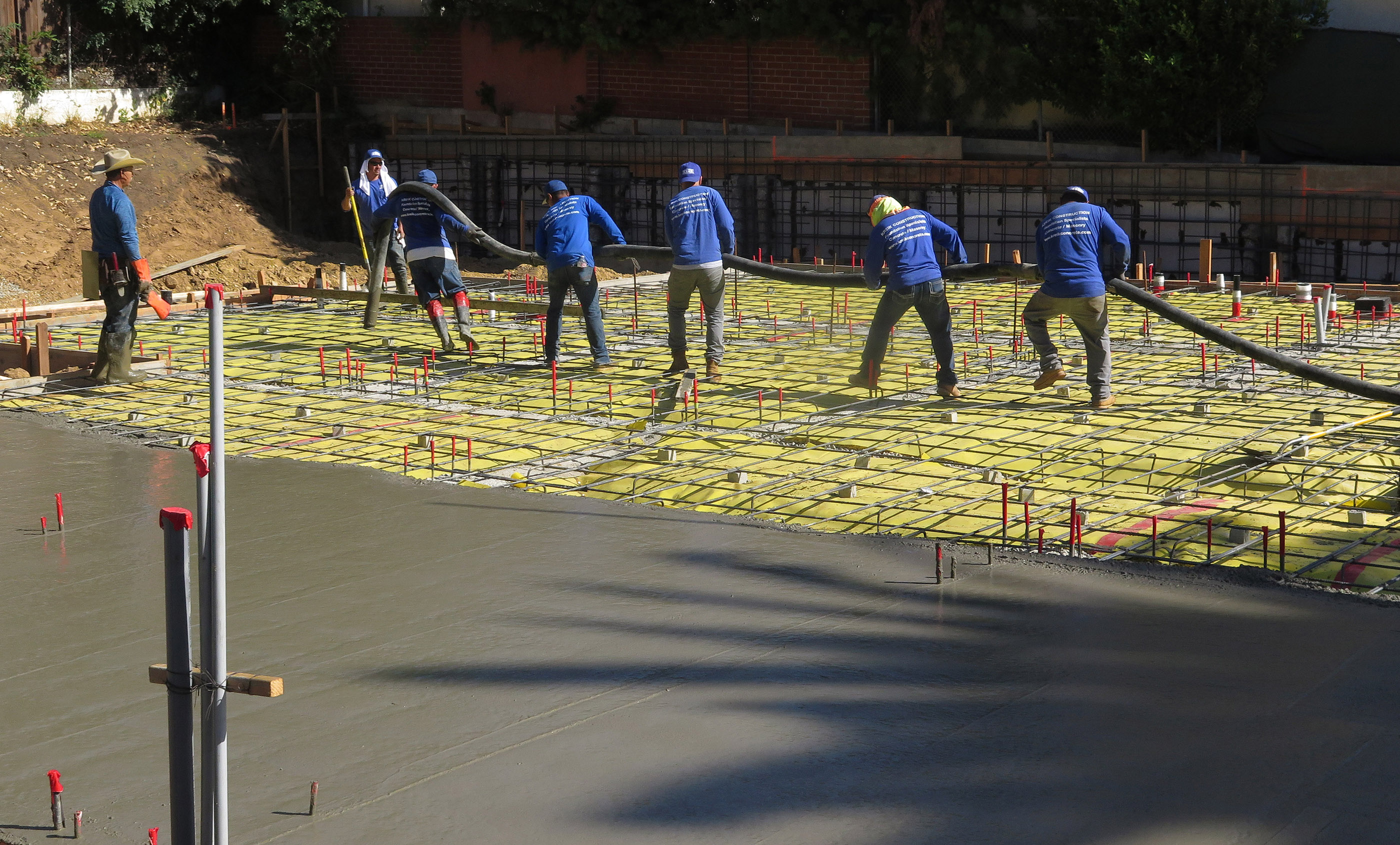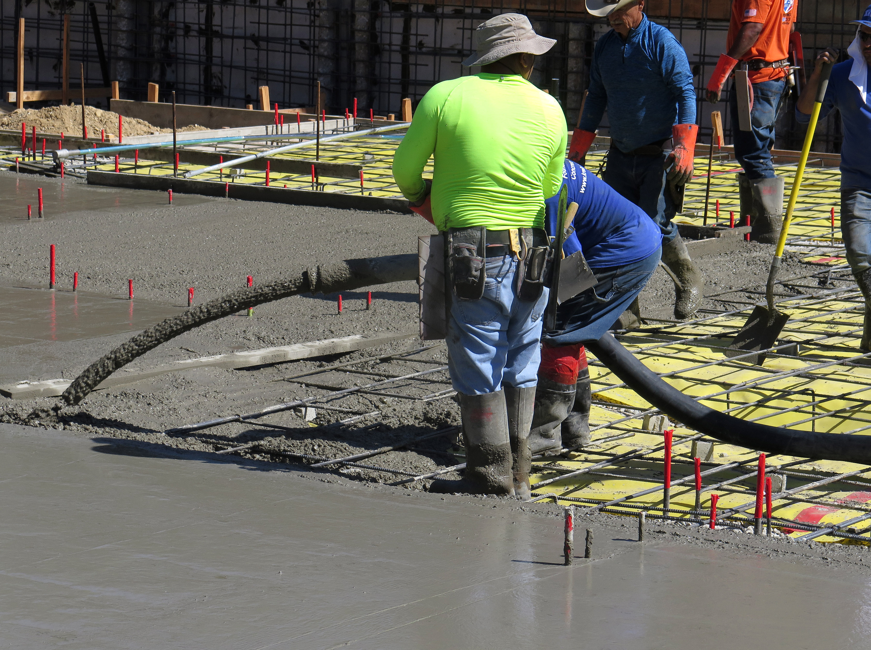 Men pull concrete hose for second pouring on June 15, 2017 North is up .