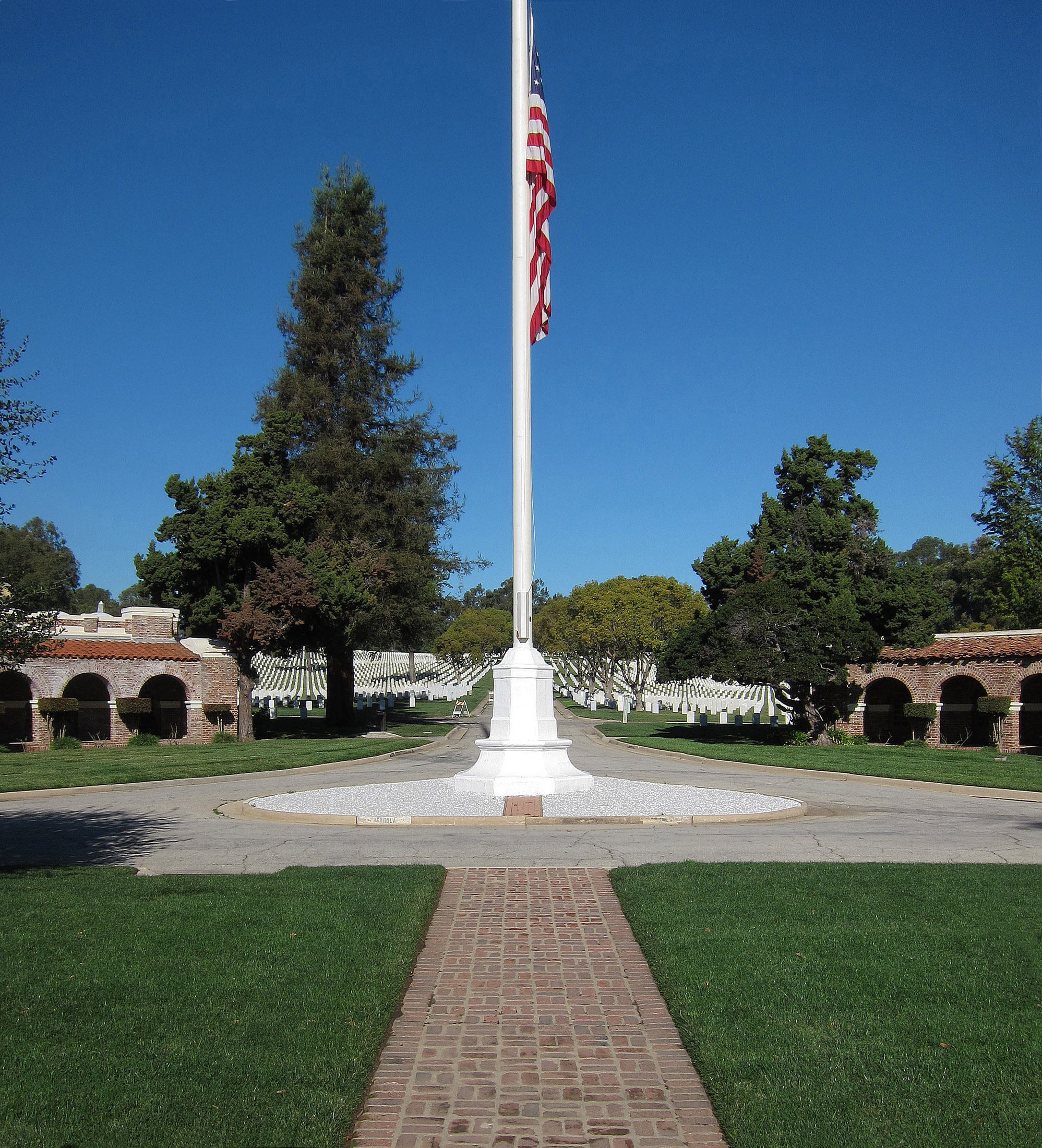 Angeles National Cemetery: Columbarium on left and Flagpole and Pergola,