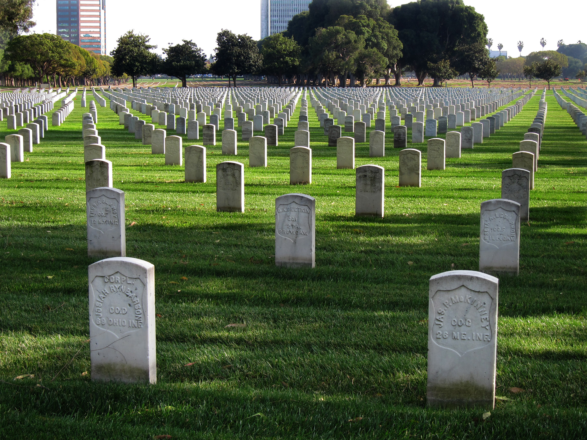 Los Angeles National Cemetery The Federal Building on Wilshire and Veteran is seen in the right background (click mouse twice over photo for an enlargement) .