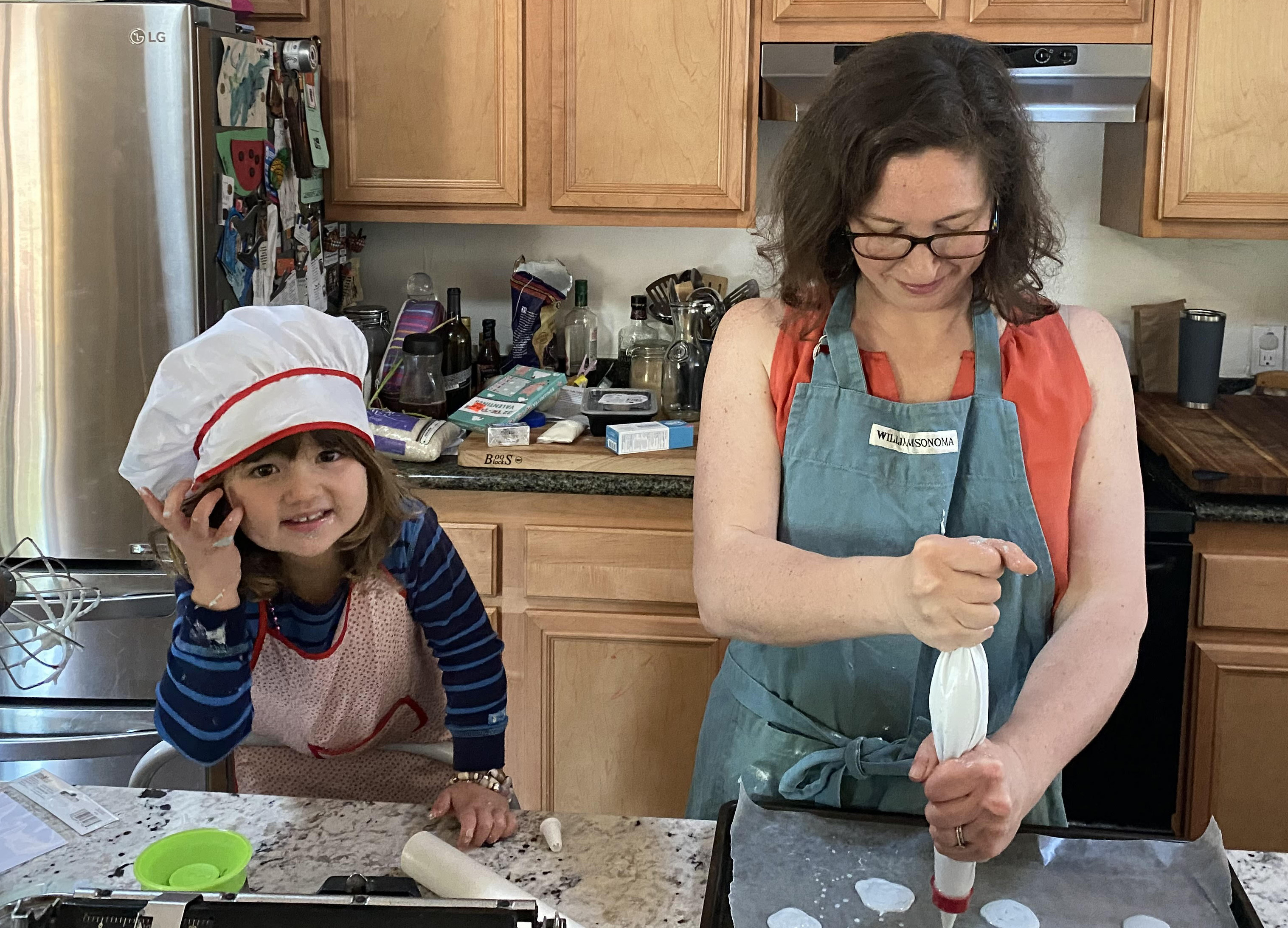 Mathilda Gustavson and mother Tiffany Stecker-Gustavson cooking -- 2021