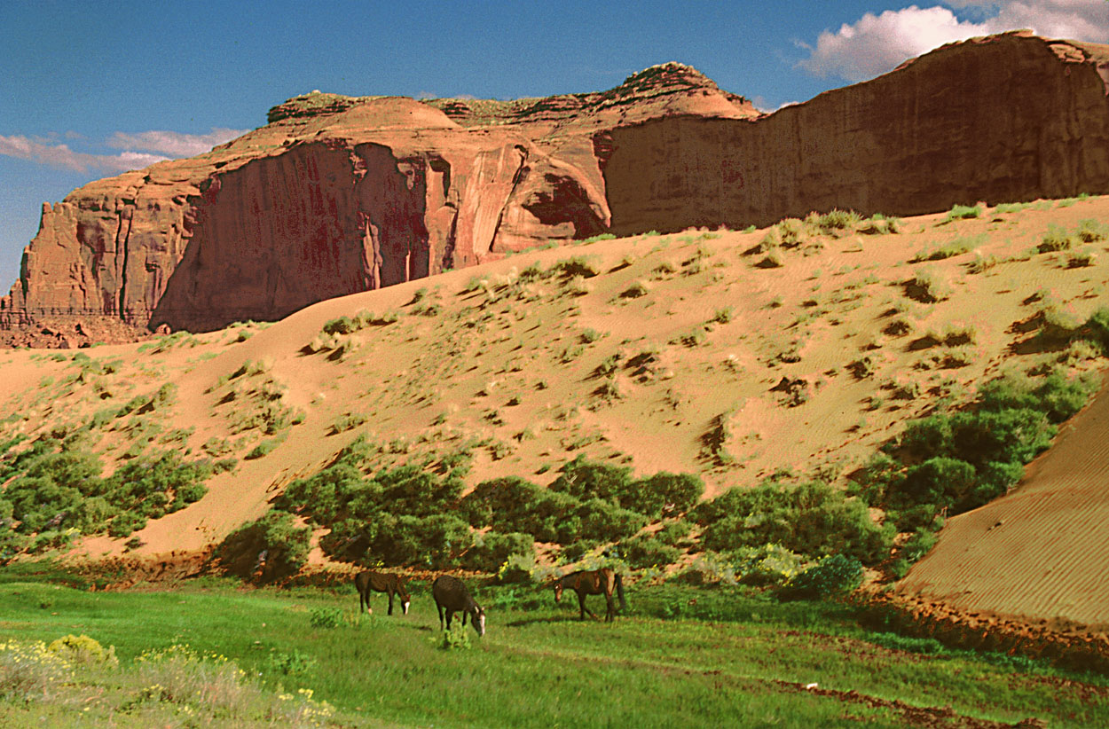 Horses grazing in a rare grassy area below the sands of Monument Valley