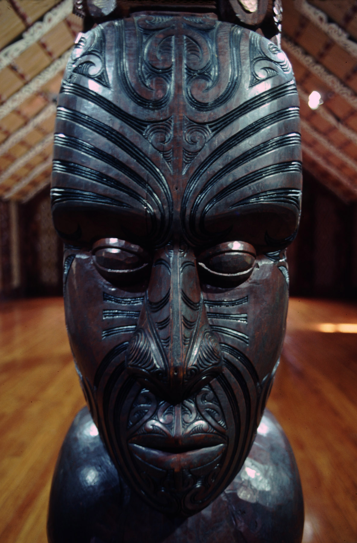 Maori wood carved statue at Marae (Maori meeting house) in Waitangi, Bay of Islands