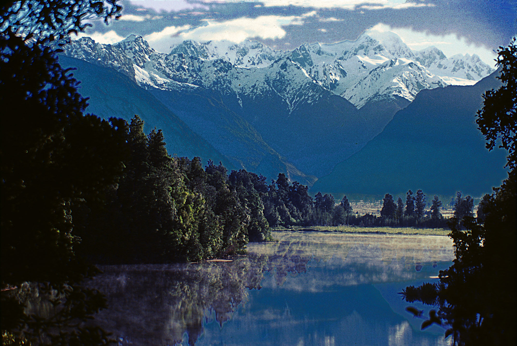 Clearing mist from Lake Matheson and the Southern Alps, South Island New Zealand