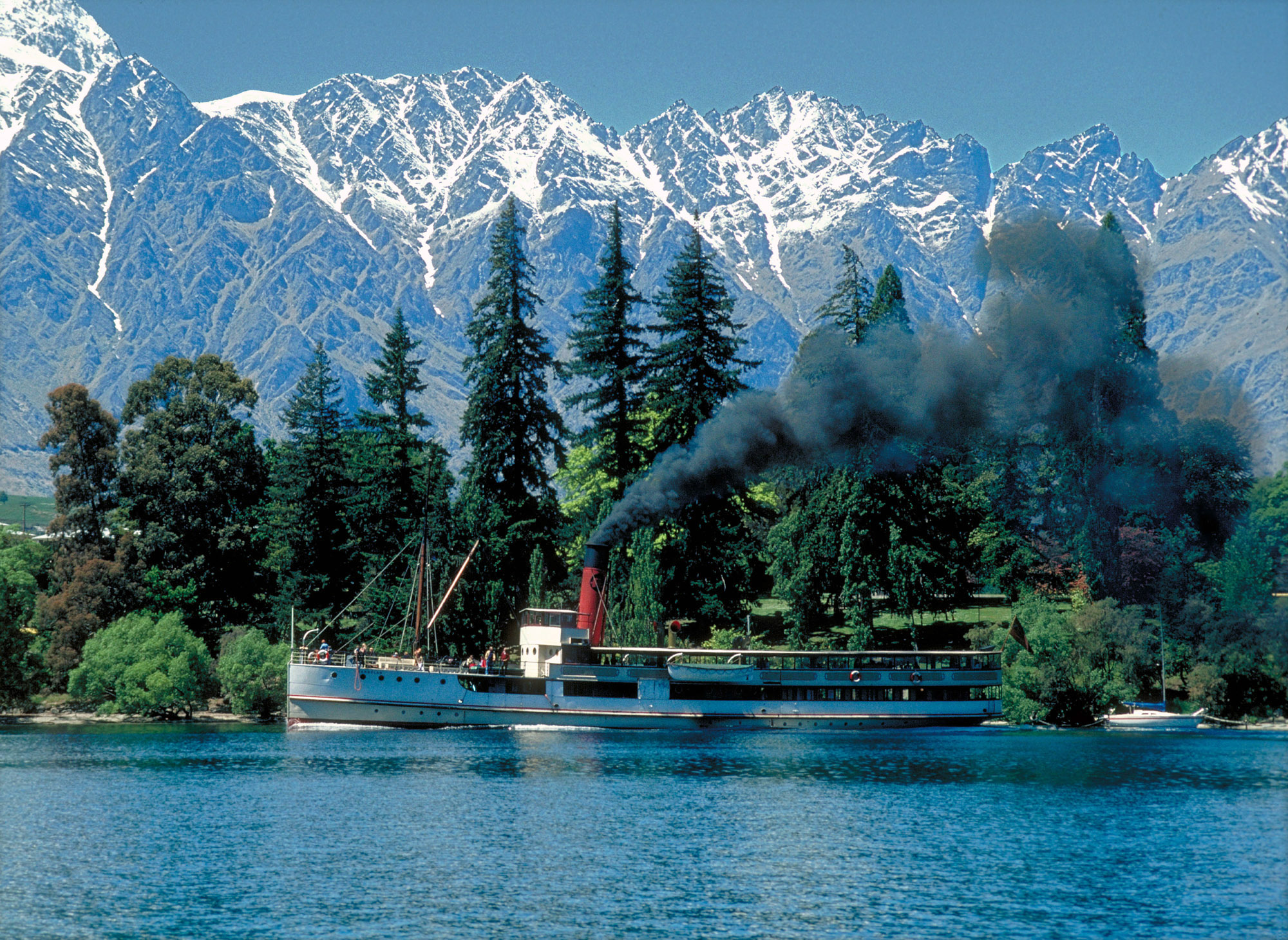 The steamer Earnslaw on Lake Wakatipo near Queenstown, South Island New Zealand. The mountains in the bakground are called the "Remarkables".
