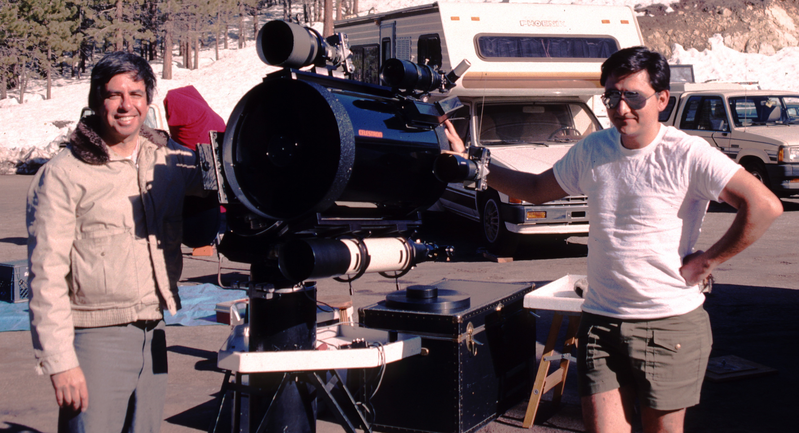 Michael A. Stecker (left) and James R. Foster in the early 1990's at the Mt. Pinos observing site (parking lot). The telescope is a Celestron 14-inch SCT on a huge Shaeffer mount with 12-inch gear.
