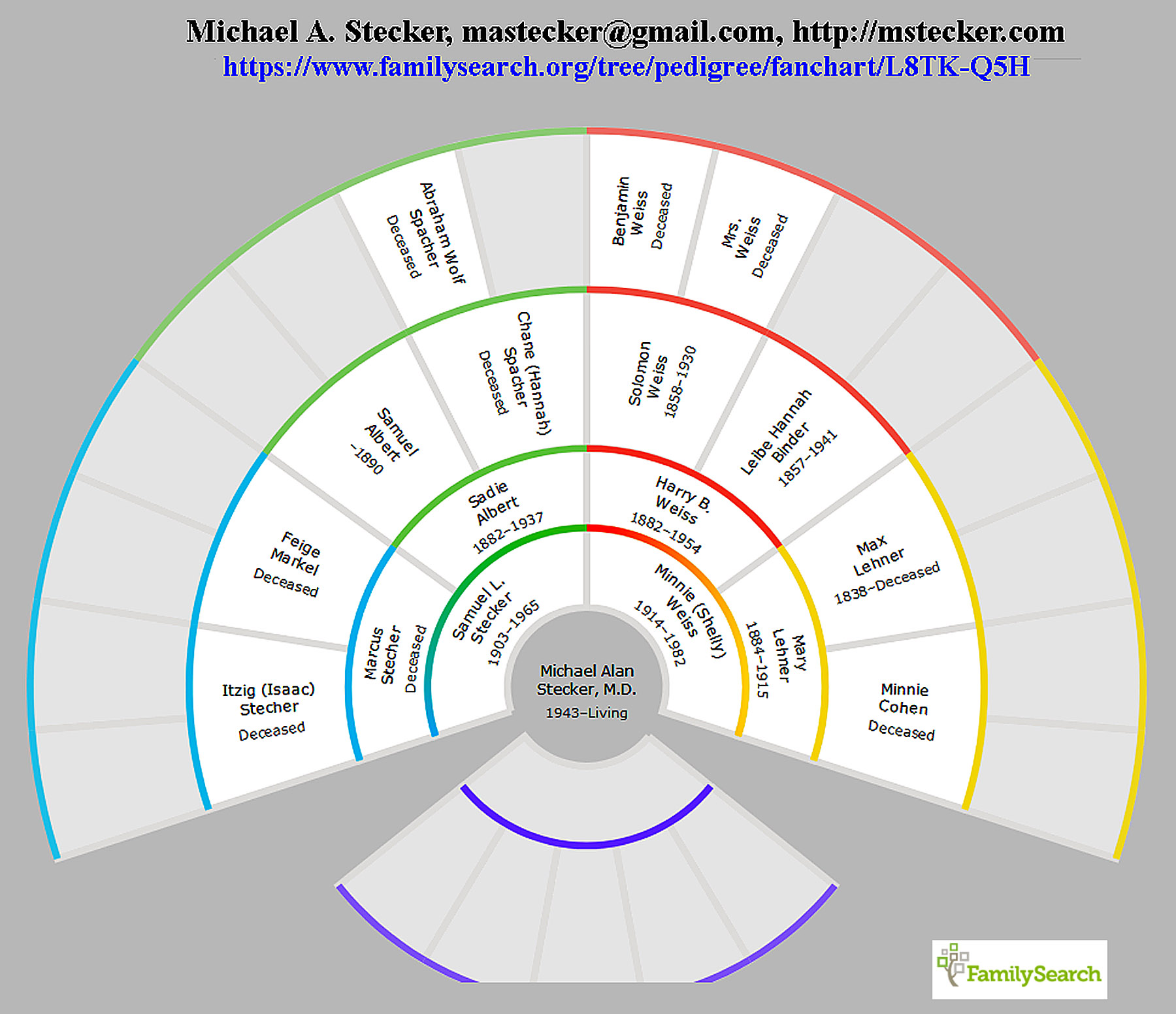 Family Search family tree fan chart of Michael A. Stecker https://www.familysearch.org/tree/pedigree/fanchart/L8TK-Q5H (requires Sign-In) |