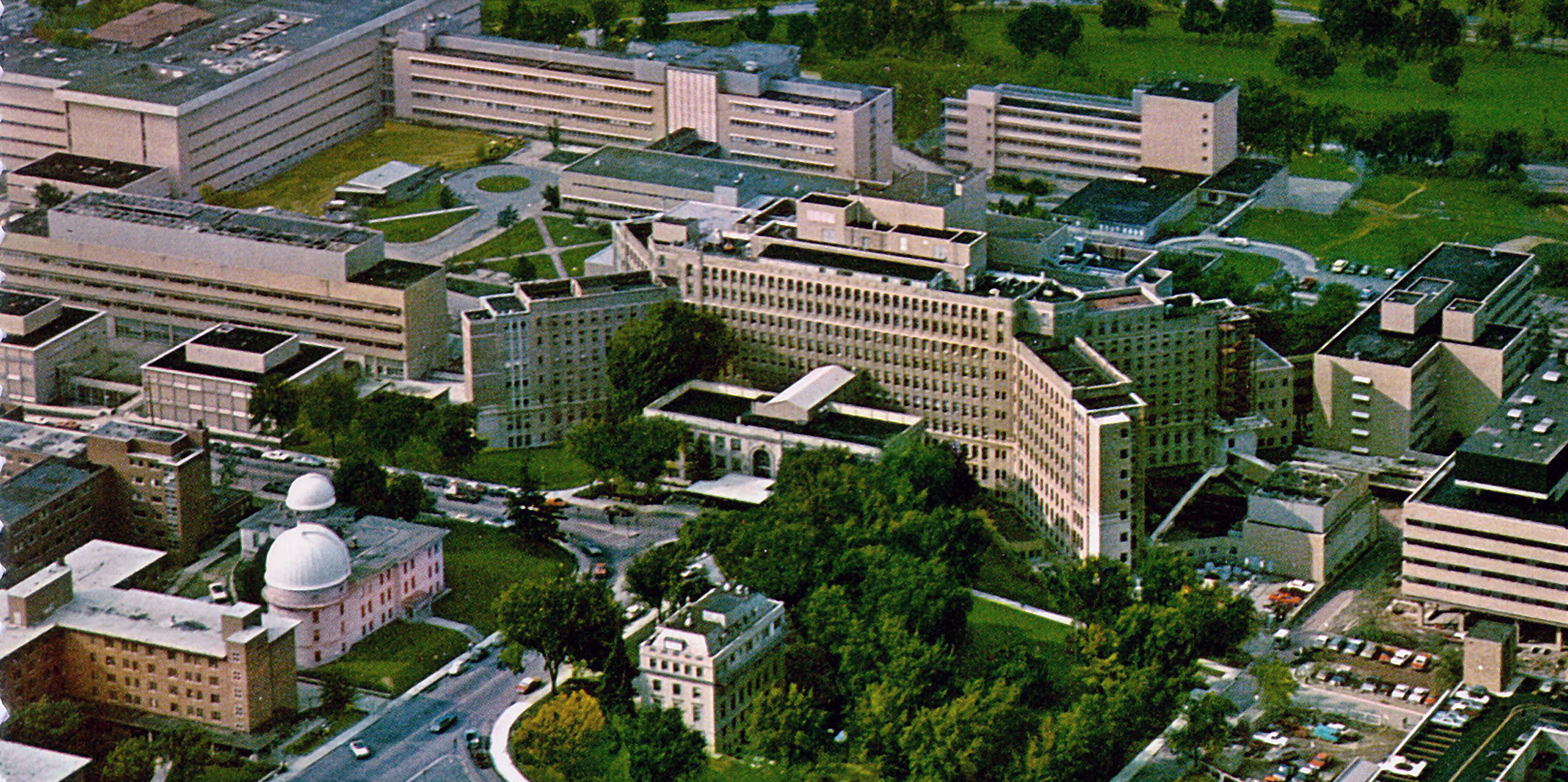 Founded in 1869, this was America's first University Hospital. The 1,000-bed "Old Main" general hospital, just right of center, is the heart of the health complex which includes the Schools of Medicine, Nursing, Public Health and research labs. |