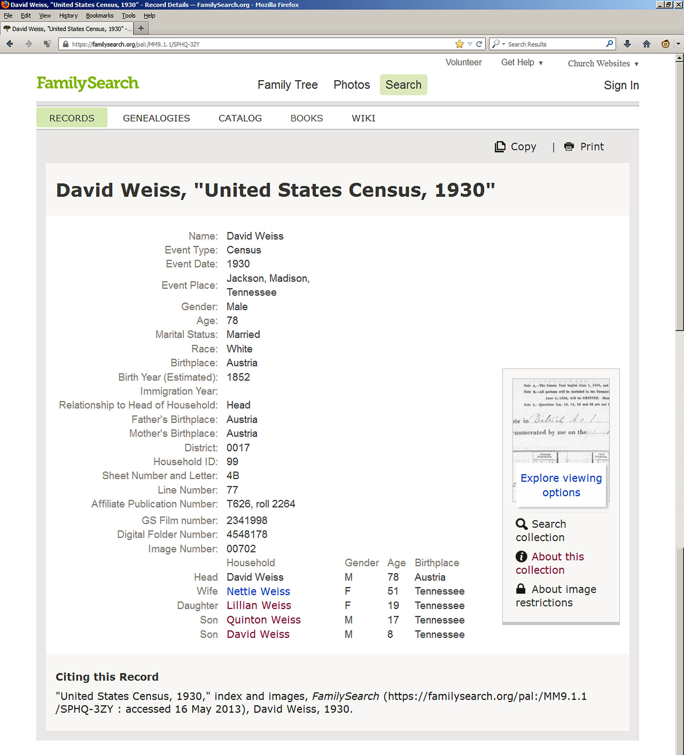 FamilySearch summary of 1930 US Census of David and Nettie
