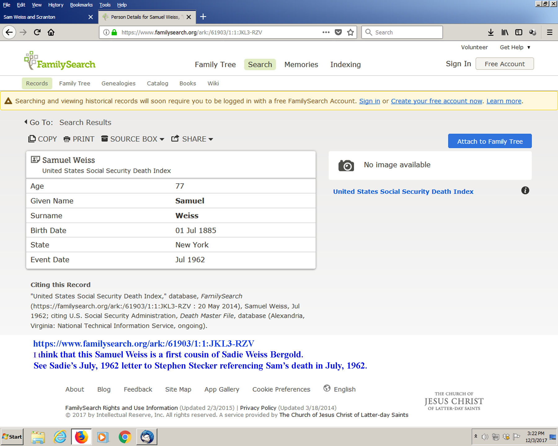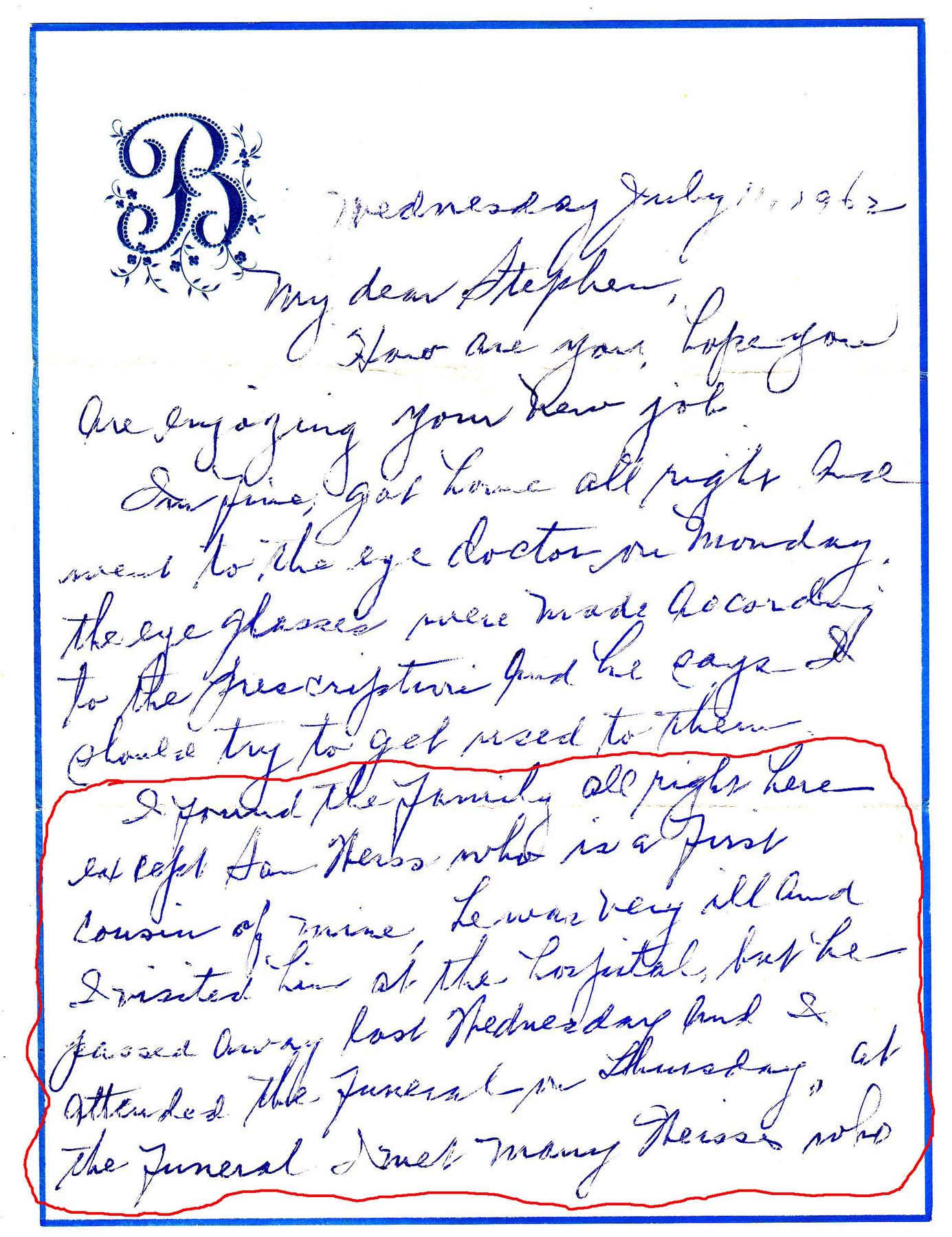 ![]() See reference to Sam Weiss death in July, 1962 in Sadie's letter above  |