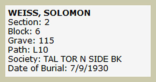 c.1851(?) - 1930 Born: about 1855 (+/-5 years) in Galicia "Austria", today south of Sanok, Poland (Szczawne ?) Immigration to USA: December, 1889 Occupation: Presser Children: 10+ Died: July 8, 1930. 87 South 1st Street, Brooklyn, NY Solomon Weiss on Find A Grave . |