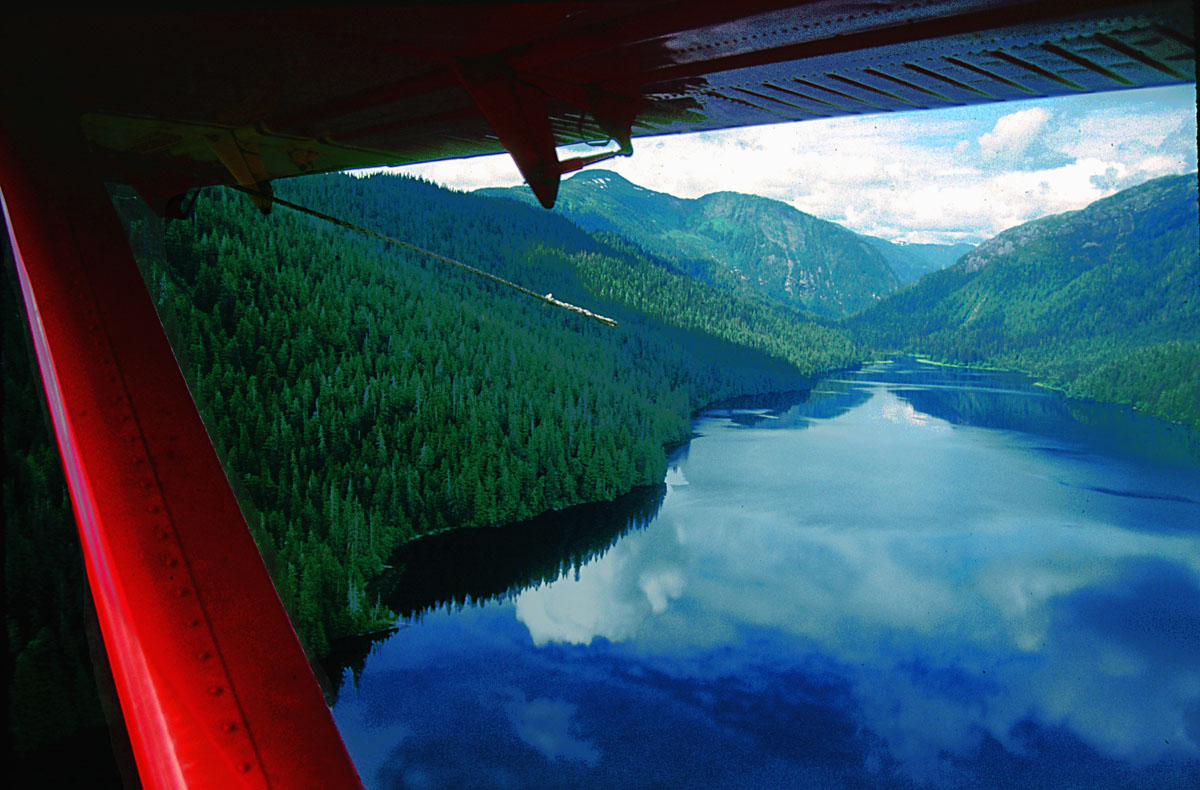 Beaver floatplane does a low pass over a wildernwss lake in Misty Fjords National Monument