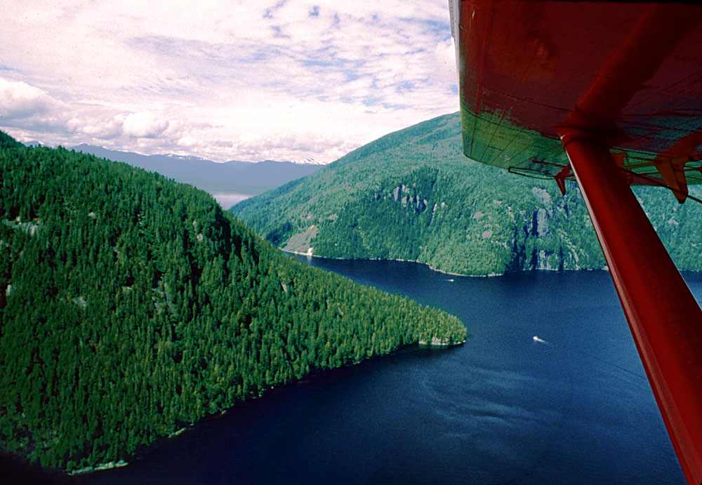 The Beaver floatplane flys over the entrance to a fjord in Misty Fjords National Monument