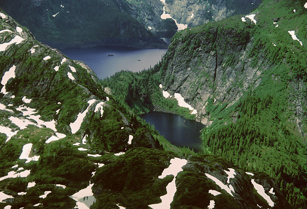 Two hikers can be seen in the shadows of a snow patch at the lower left. They are approaching a secluded lake that fills a "bowl" in the mountain. Near the top of the photo is a fjord.