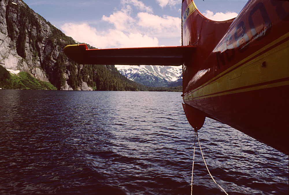 Beaver floatplane lands on a lake in Misty Fjords National Monument