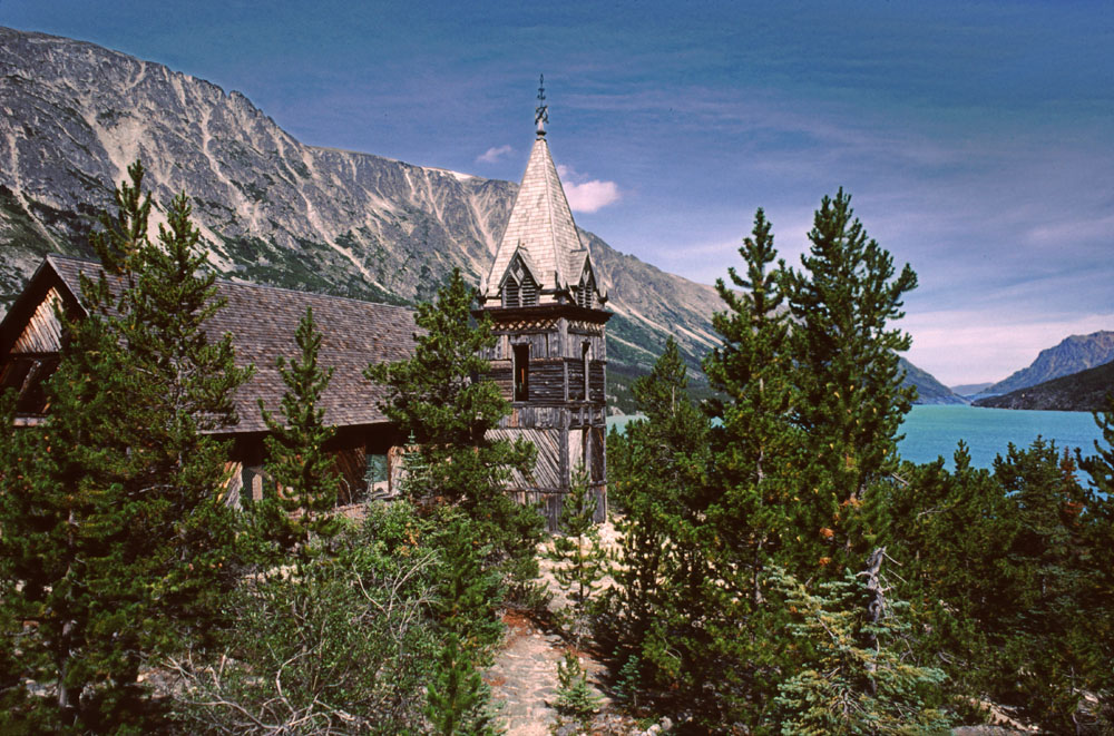 Yukon gold fields.  Seen here is its stop at Lake Bennett and St. Andrew's Church in the Yukon.
