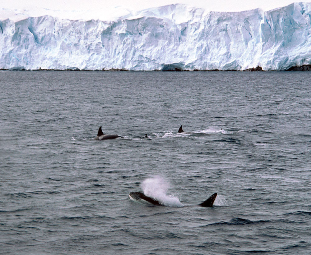 Killer Whales off the coast of Antarctica. The one in the foreground is a male with a straight edge to the back of its dorsal fin, while the two in the background are females with a curved back edge on their dorsal fins.