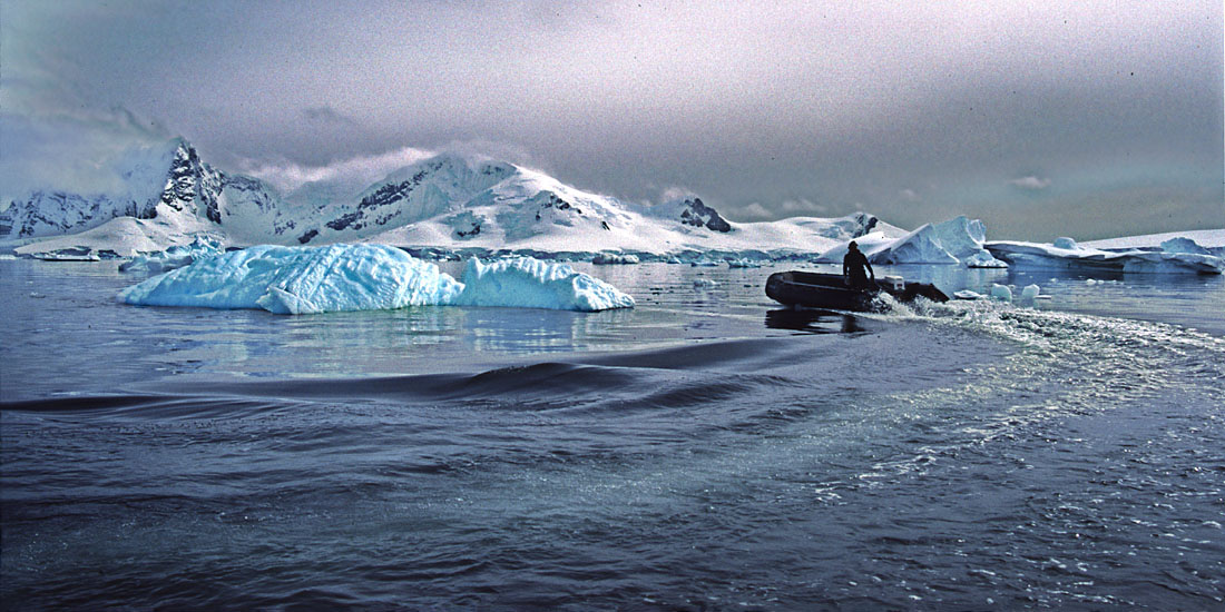 Zodiac rubber boats are use for transport in Paradise Bay, Antarctica