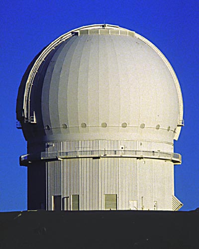 yoke type similar to the Palomar 5 meter telescope. It is a classical prime focus/Cassegrain combination. The primary mirror has a usable diameter of 3.58 meters and has a parabolic figure. The primary and secondary mirrors are made of the low expansion coefficient glass-ceramic "Cer-Vit". .  |