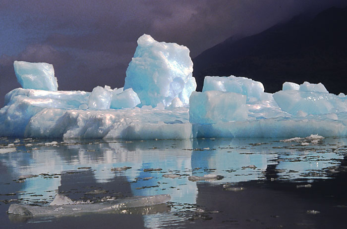 Stack of blue icebergs in the calm waters of Laguna San Rafael, Chile