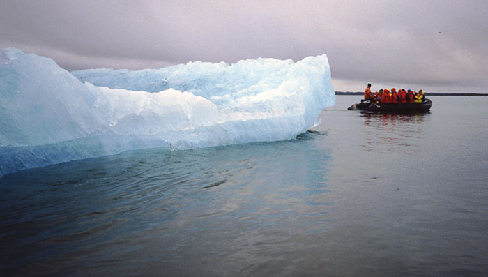 A Zodiac rubber boat approaches an iceberg in Laguna San Rafael, Chile