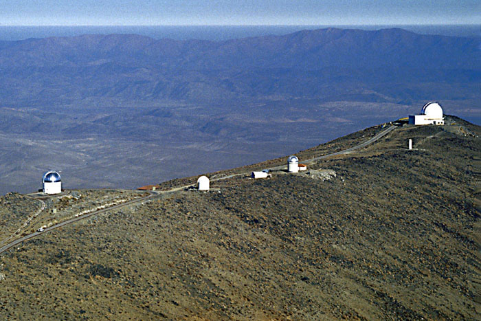 I took this photo from the hill of the future Magellan Telescopes when my friend James Foster and I visited Las Campanas for 10 days and nights in February, 1996. The observatory is at an altitiude of 2280 meters (7480 feet). At the far right is the DuPont 100-inch telescope, while at the far left