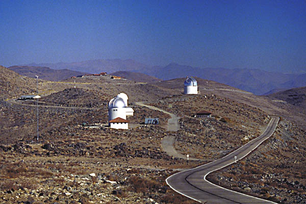 Chile in February, 1996. My telescope was set up near Canada House (the low building with dark red roof to the right of the small central dirt road). The 40-inch Swope Telescope is at the upper right and the other silver domed Polish Telescope to the left of center. Just behind the Polish Telescope is a low white building that houses the Bruce Telescope that discovered Supernova 1987A in the Large Magellanic Cloud. This photo was taken from the parking lot of the DuPont 100-inch Telescope. |