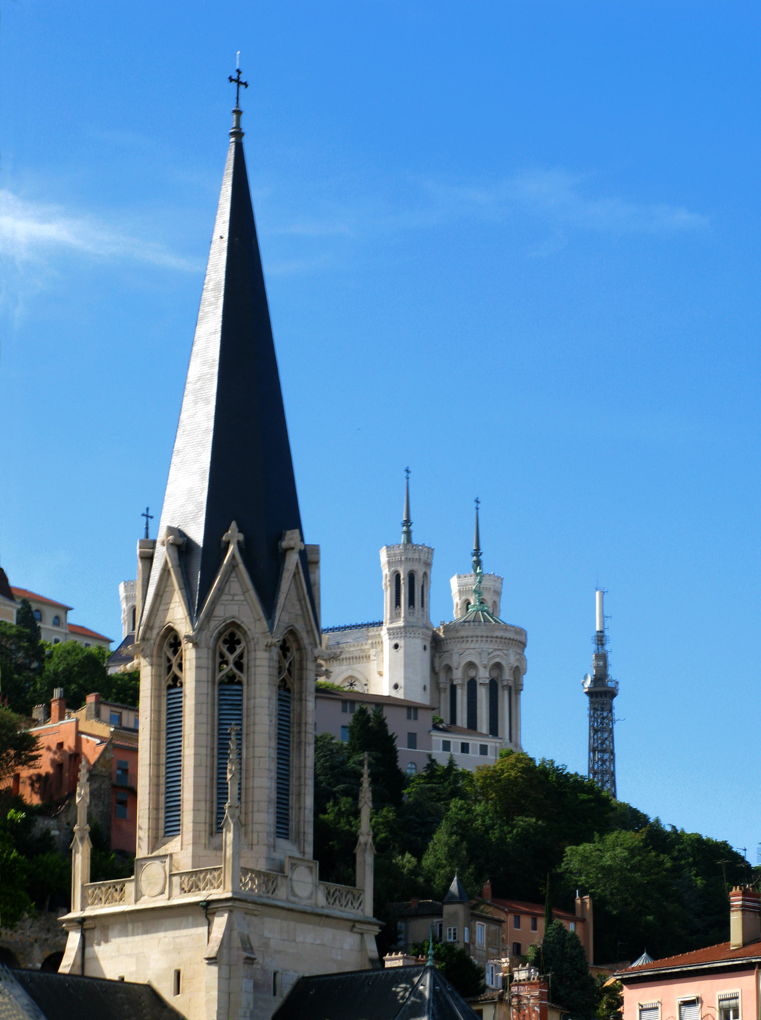 St. Georges steeple, Notre Dame de Fourviere and Tour Metallic (radio tower) atop Fourviere hill, Lyon